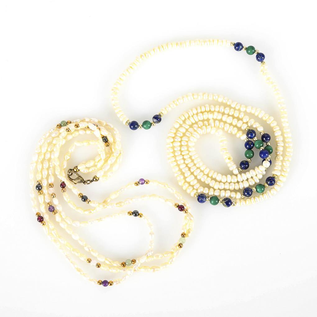 Durchgehende Zuchtperlenkette mit Malachit- und Lapislazulikugeln. 2-reihige Schnürkette mit Granat-, Amethyst- und Hämatitkugeln, an Karabinerschloss.
