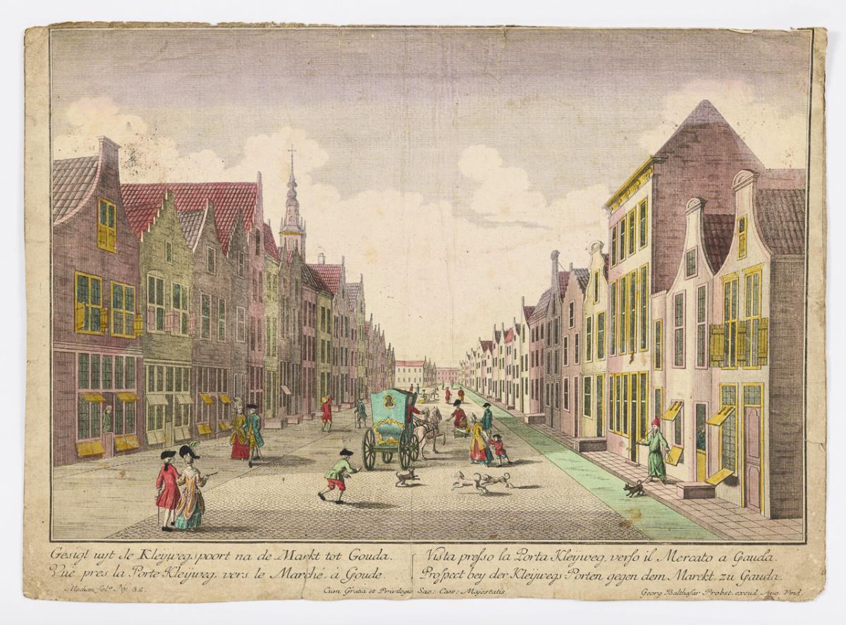 In niederländischer, französischer, italienischer und deutscher Sprache bezeichnet: "Prospect bey der Kleijwegs-Porten gegen dem Marckt zu Gouda". Stark griffspurig, stockfleckig, auf Papier montiert, mit kleinen Rissen.