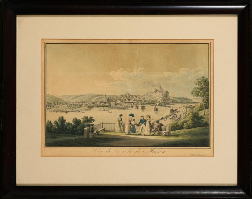 Stadtansicht von Meißen: "Vue de la ville de Meissen", Blick vom Ratsweinberg über die Elbe und die Elbbrücke auf die Altstadt und den Burgberg mit Albrechtsburg und Dom, im Vordergrund Staffagefiguren. Stockfleckig.