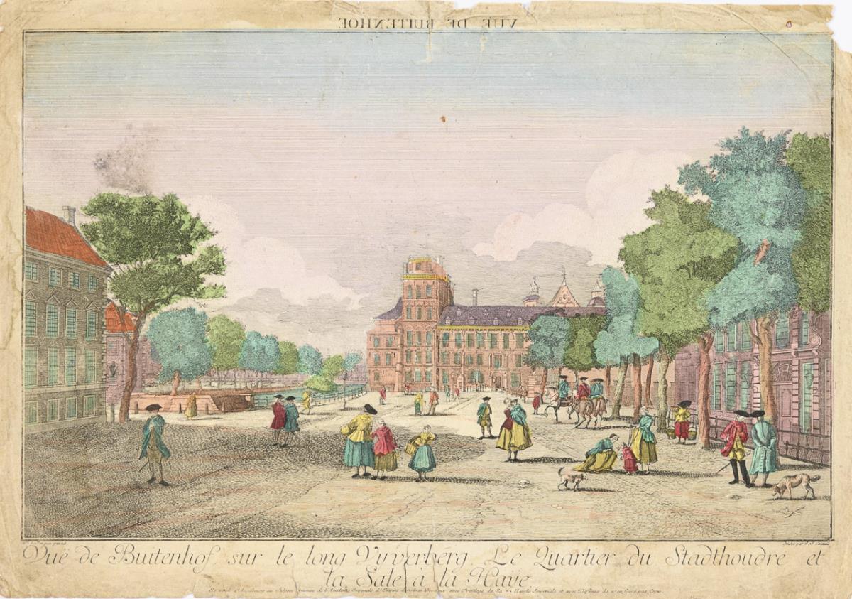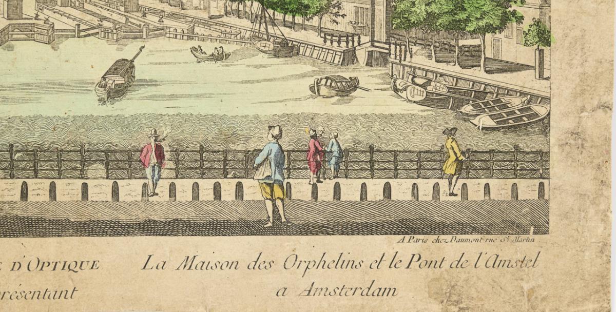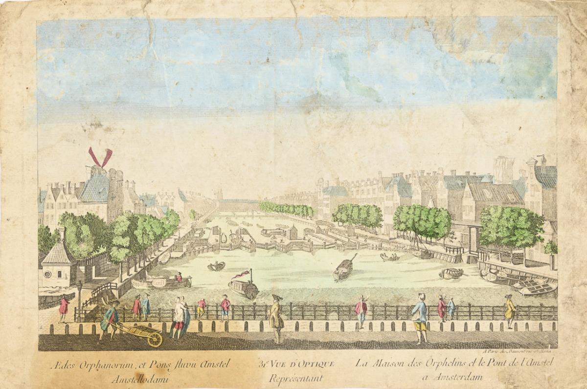 Seitenverkehrte Ansicht des Gebäudekomplexes Binnenhof im Zentrum von Den Haag: "Vue de Buitenhof sur de long Vyverberg. Le Quartier du Stadthoudre et la Sale à la Haye.", Blatt: 30,5 x 43,5 cm, stark griffspurig, am Rand beschädigt, Wasserflecken | Tiefenillusorische Ansicht des Flusses Amstel in Amsterdam mit Blick auf das Armenwaisenhaus, verlegt von Daumont, Paris : "Vue d'optique representant", "La Maison des Orphelins et le Pont d'Amstel a Amsterdam", Blatt: 28,2 x 42 cm, stark griffspurig, knitterig und hinterklebt.