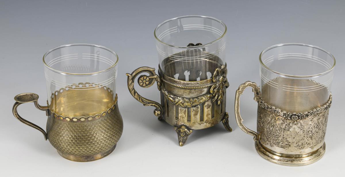 Verschiedene Teeglashalter mit Glaseinsatz und 5 in Niello-Technik verzierte Kaffeelöffel (19. Jh.). Altersspuren.
