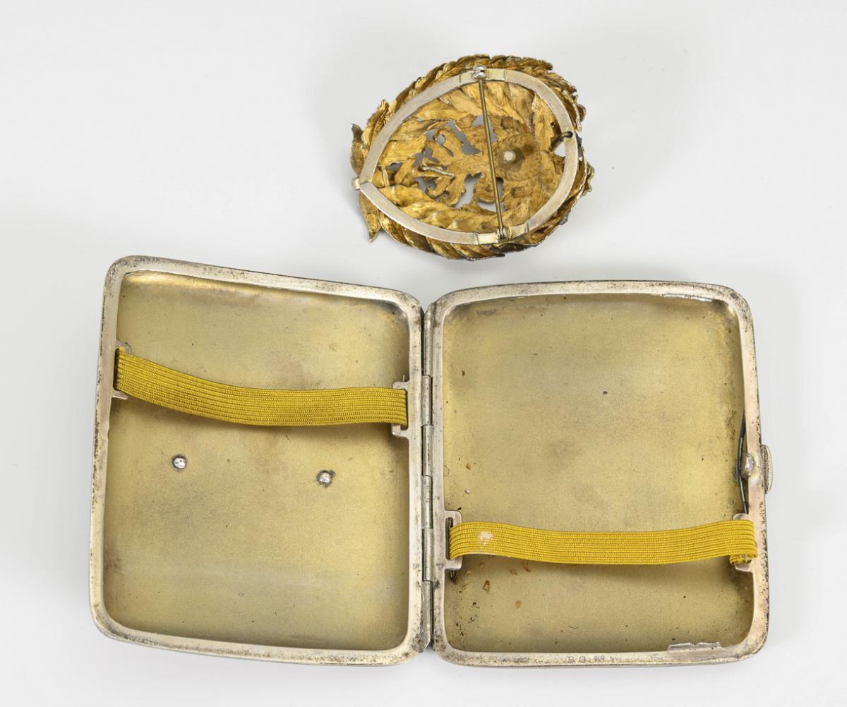 Silbernes Zigarettenetui und Brosche mit Doppeladler.