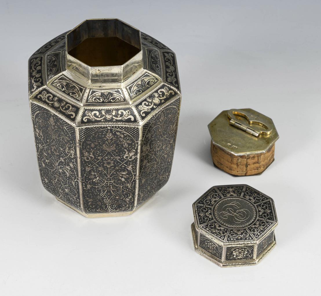 8-eckiger Korpus, in Niello-Technik reich verziert. Auf dem Deckel Monogrammgravur "ERS". Kaum Gebrauchsspuren.