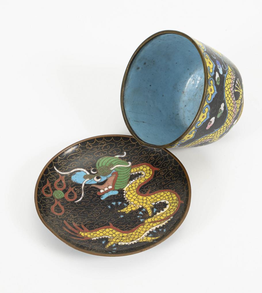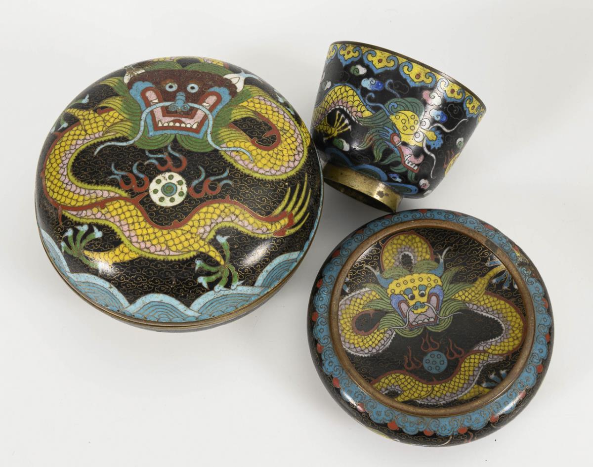 Deckelvase, Dose, Kumme, Ascher und kleiner Teller. Alle mit gelbem Drachen auf schwarzem Grund und Wolkenmuster. Kleiner Teller mit Abplatzern auf der Unterseite, Dose mit kleiner Fehlstelle am Drachenhorn und größeren Abplatzern innen sowie Ascher mit kleiner Fehlstelle am Rand. Deckelvase in Ordnung.