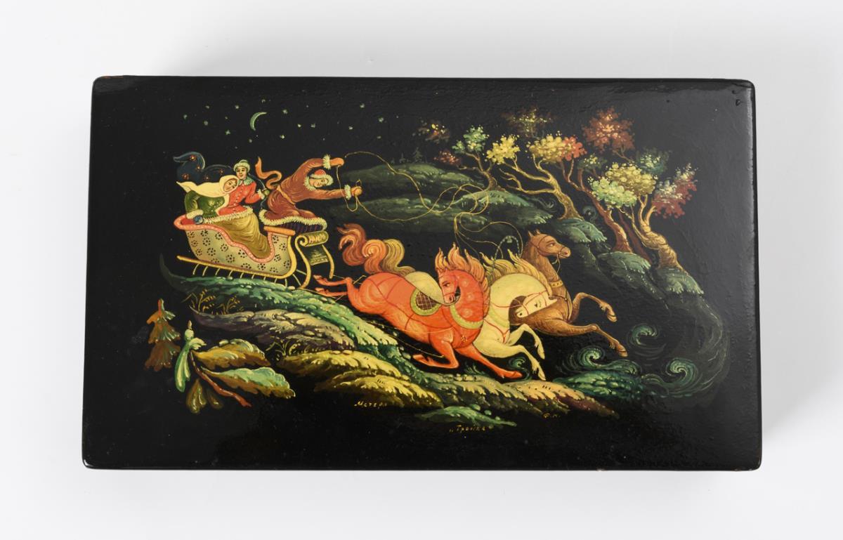 Fein gemalte Märchenszenen auf den Deckeln. Große Schatulle minimale Chips an den Kanten, ovale Dose nicht zu öffnen.