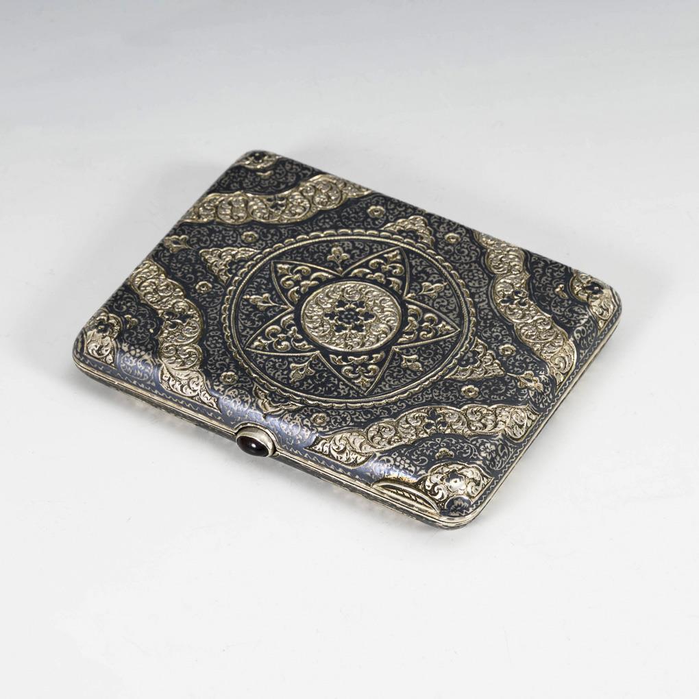 In Niello-Technik gearbeitetes, reich verziertes Etui mit rotem Ovalcabochon an der Schließe. Leichte Gebrauchsspuren.