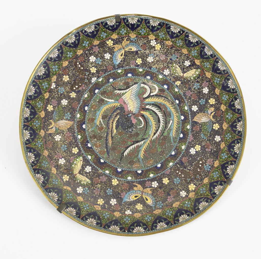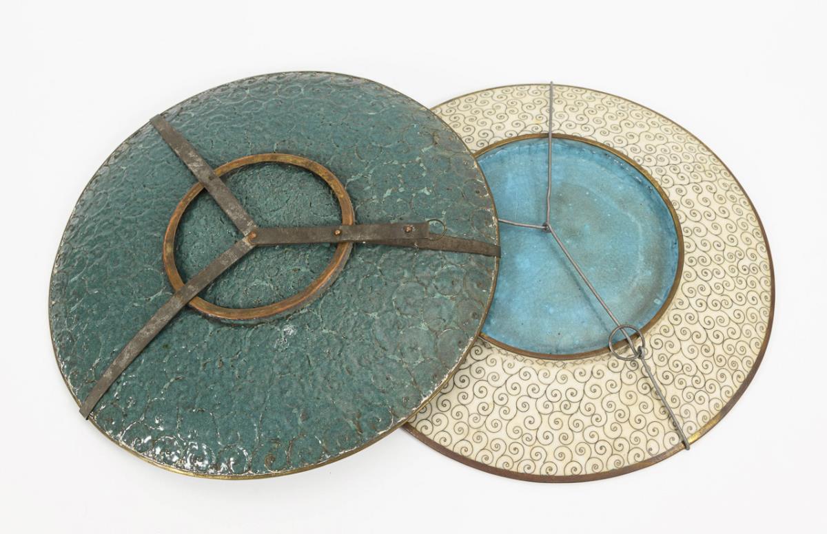 Zwei Kraniche zwischen blühenden Pflanzen (Winde, Chrysantheme und andere Pflanze). Unterseite Spiralmuster auf weißem Grund. / Phönix und Schmetterlinge auf dunklem, glitzerndem Grund. Reliefierte Unterseite mit Spiralmuster. Beide mit Wandhalterungen.