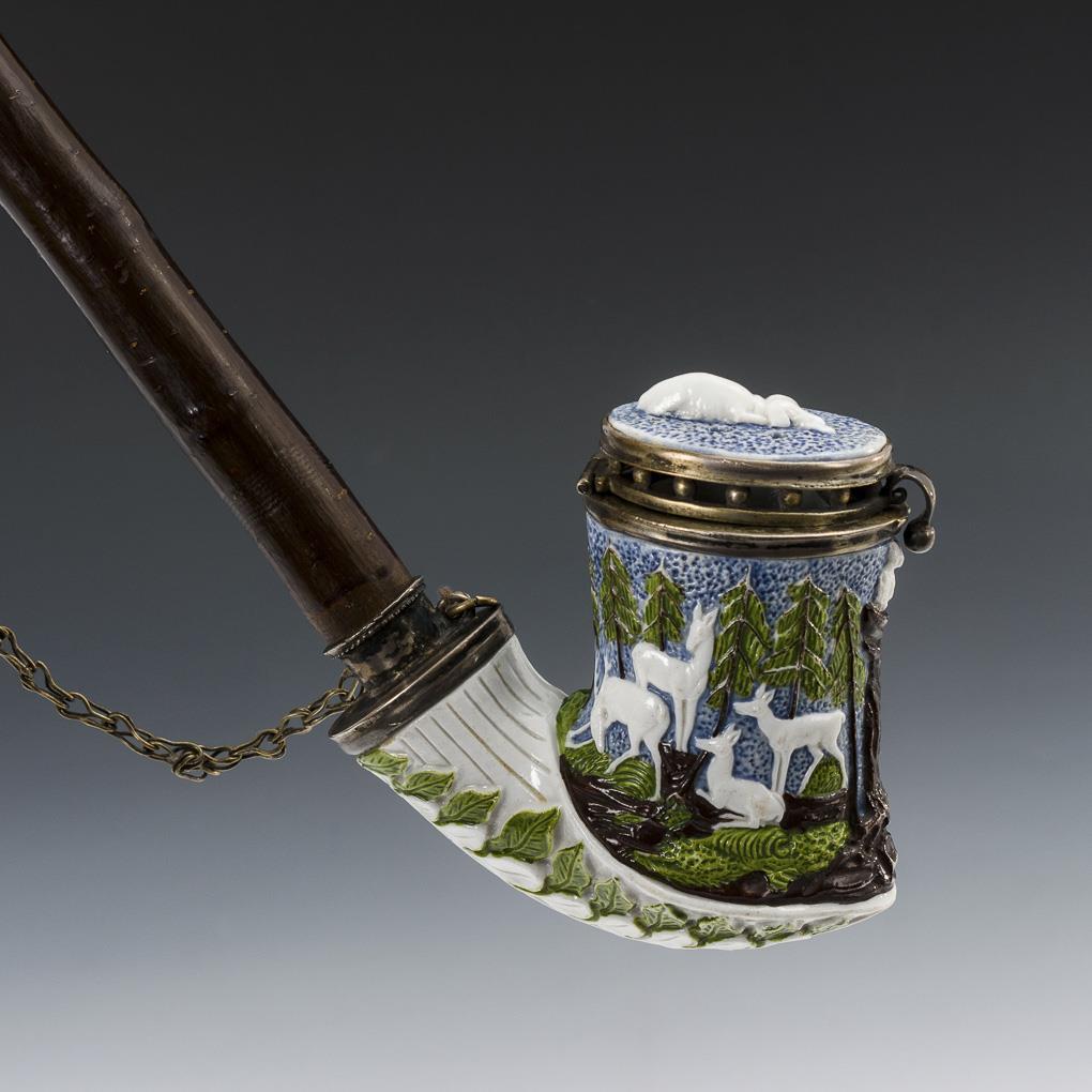 Reliefpfeifenkopf mit silbermontiertem Scharnierdeckel (13 Lot/Meistermonogramm HD gepunzt). Allseitig ein Jagdrelief mit einem Sprung Rehe sowie Jägern mit Hunden in einem Waldstück. Mit Gestänge.