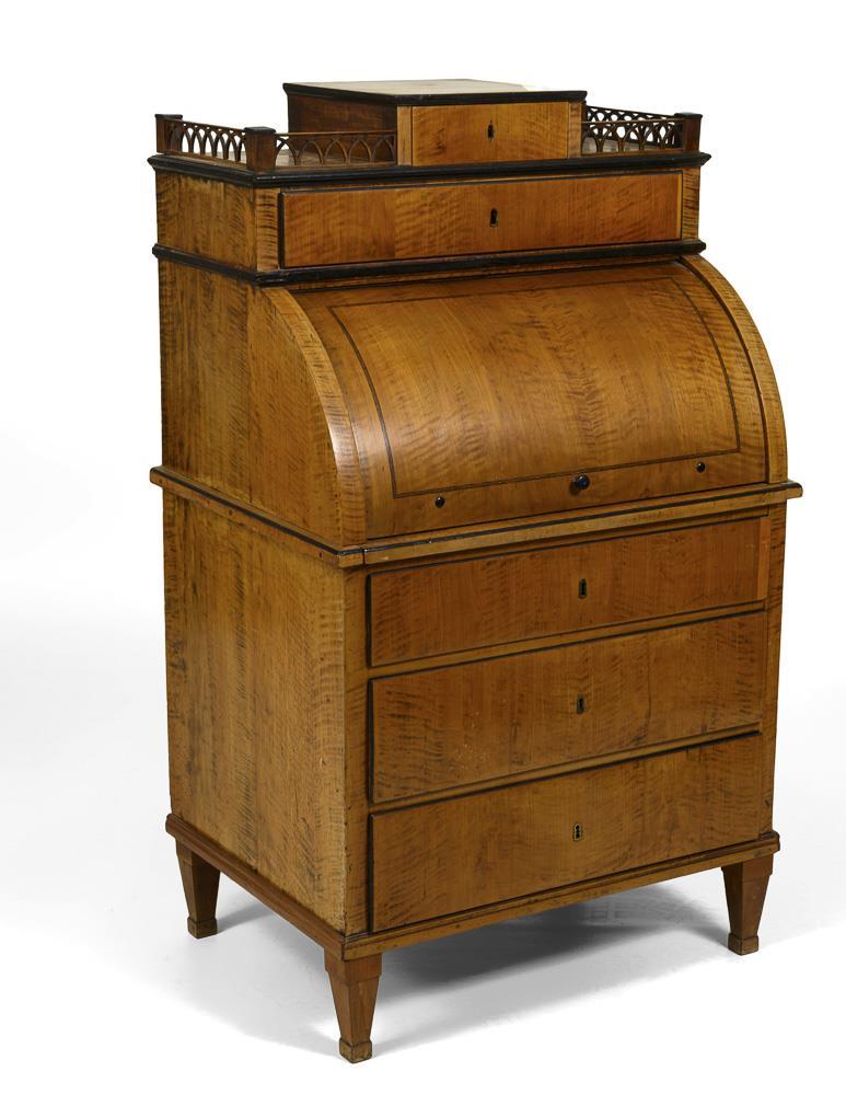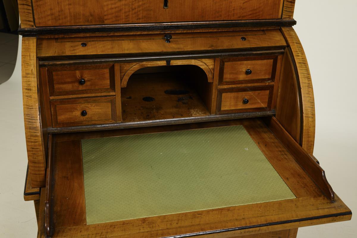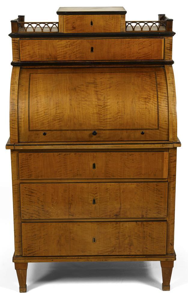 Sekretär auf 3-schübigem Kommodenunterteil mit zylinderartiger, versenkbarer Schreibklappe, darüber getrepptes Gesims mit 2 verschieden großen Schüben und Rundbogengalerie; Innenteil mit herausziehbarer Schreibplatte mit hellgrünem Stoffbezug, 4 Schüben und offener Ablage. Alters-/Gebrauchsspuren, restaurierungsbedürftig.