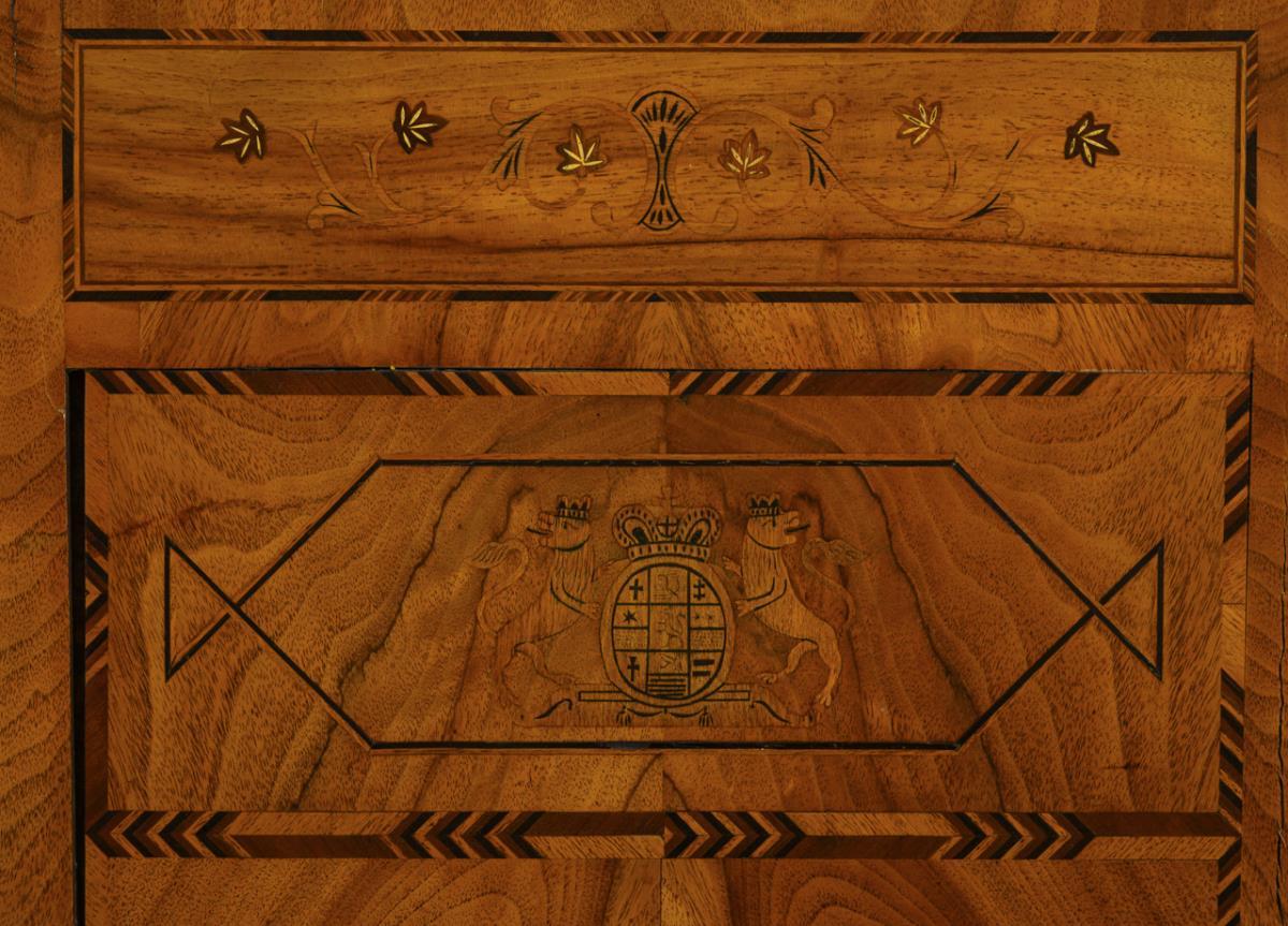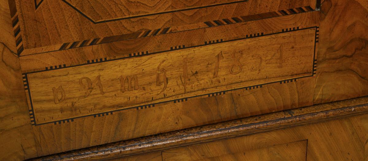 2-türiger Wäscheschrank mit 2 kleinen Sockelschüben, aufwendig verziert mit feinem Spiegelfurnier, Band- und Rankenmarketerien, Doppeladler und Wappenzierde, Inschrift "Catharina Gerhard v K m h s 1854"; innen mit mehreren Kleiderhaken. Alters-/Gebrauchsspuren, stärkere Trockenrisse, alt restauriert.