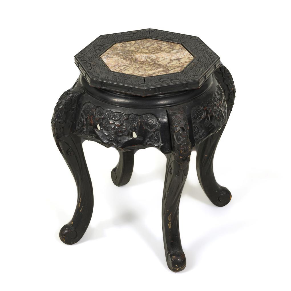 Vier geschwungene Beine, beschnitzte Blütenzarge mit dezenten Durchbrüchen gearbeitet. Sechseckige Tischplatte mit eingelegter Marmorplatte. Alters- und Gebrauchsspuren.