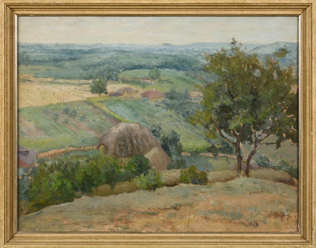 Blick von einem Hügel hinab über die Felder zum Gehöft in weiter bergiger Landschaft. Ein kleiner Defekt.