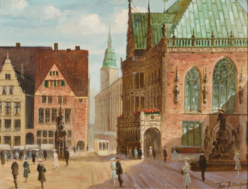 Staffagefiguren auf dem Platz vor dem Rathaus mit nahender Straßenbahn.