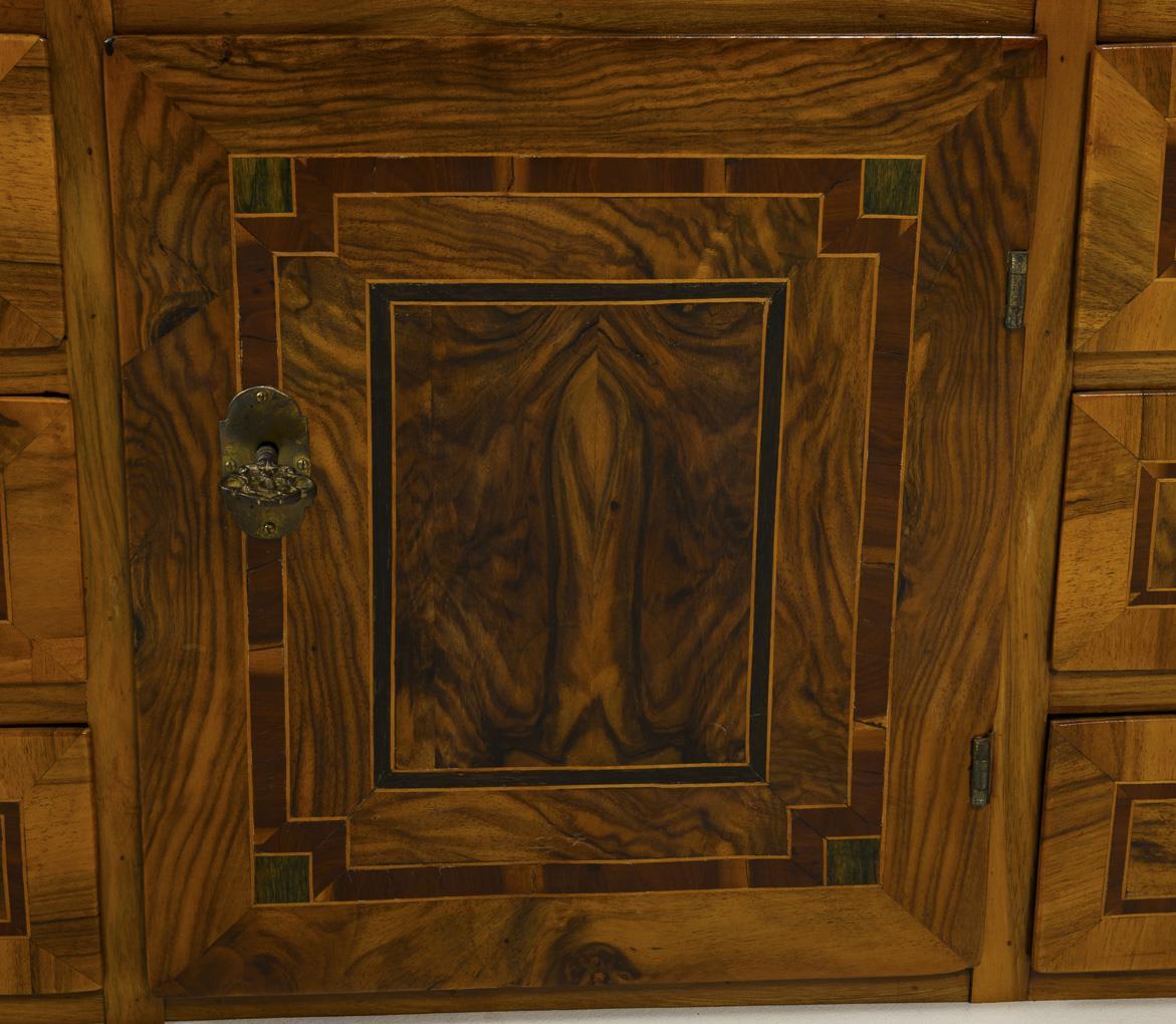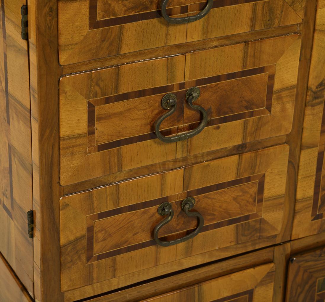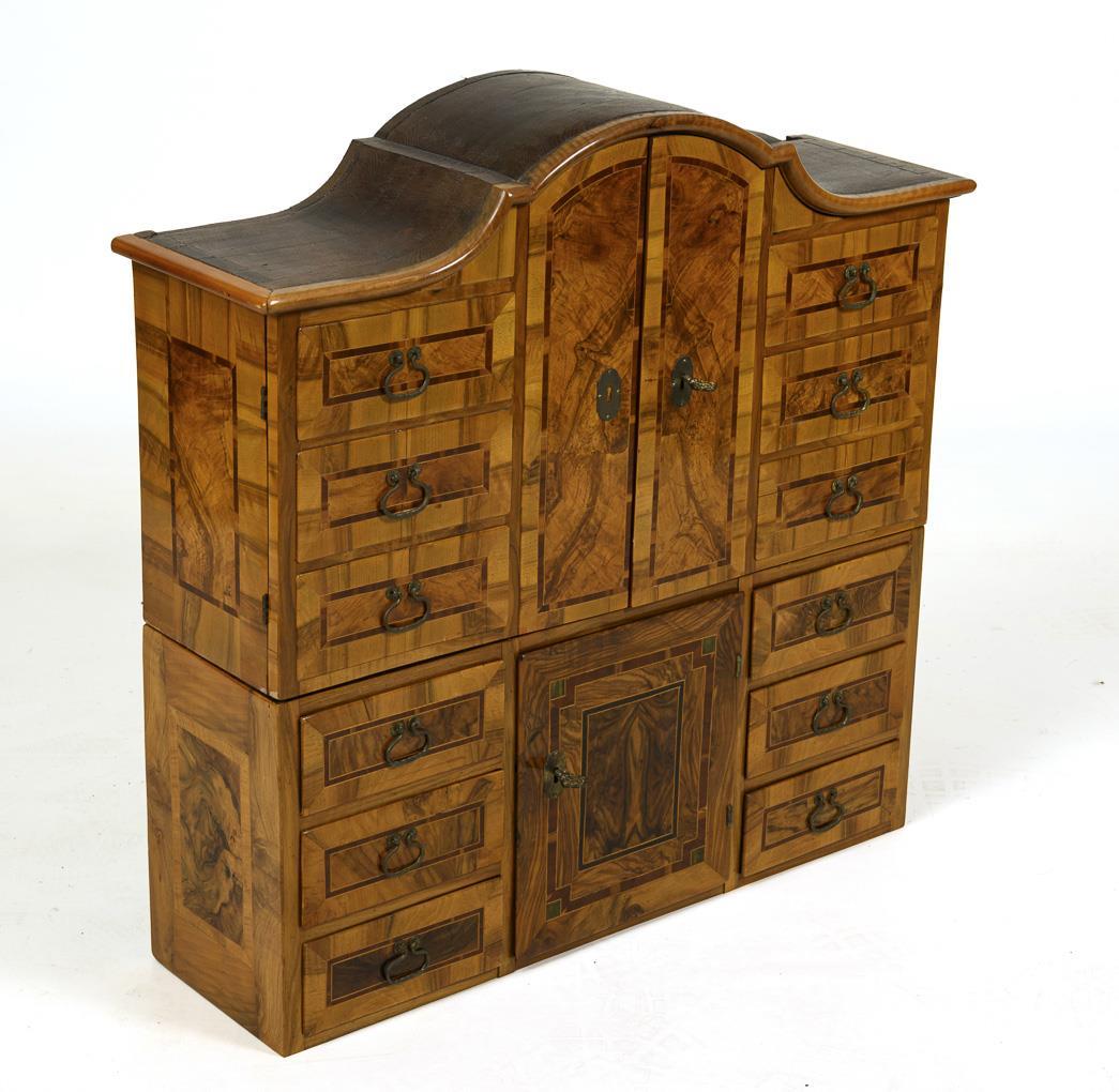 2-teiliger Tabernakelaufsatz, Oberbau mit geschwungenem Giebel und 2-türiger Blenderfront mit 6 Scheinschüben und Mittelfach, kastenförmiger Unterbau mit verschließbarem Mittelfach und 6 Schüben; reich verziert mit Maserfurnier und Bandintarsien; Oberteil innen 2 Einlegeböden, Unterteil innen 1 Einlegeboden. Alters-/Gebrauchsspuren, leicht verzogen.