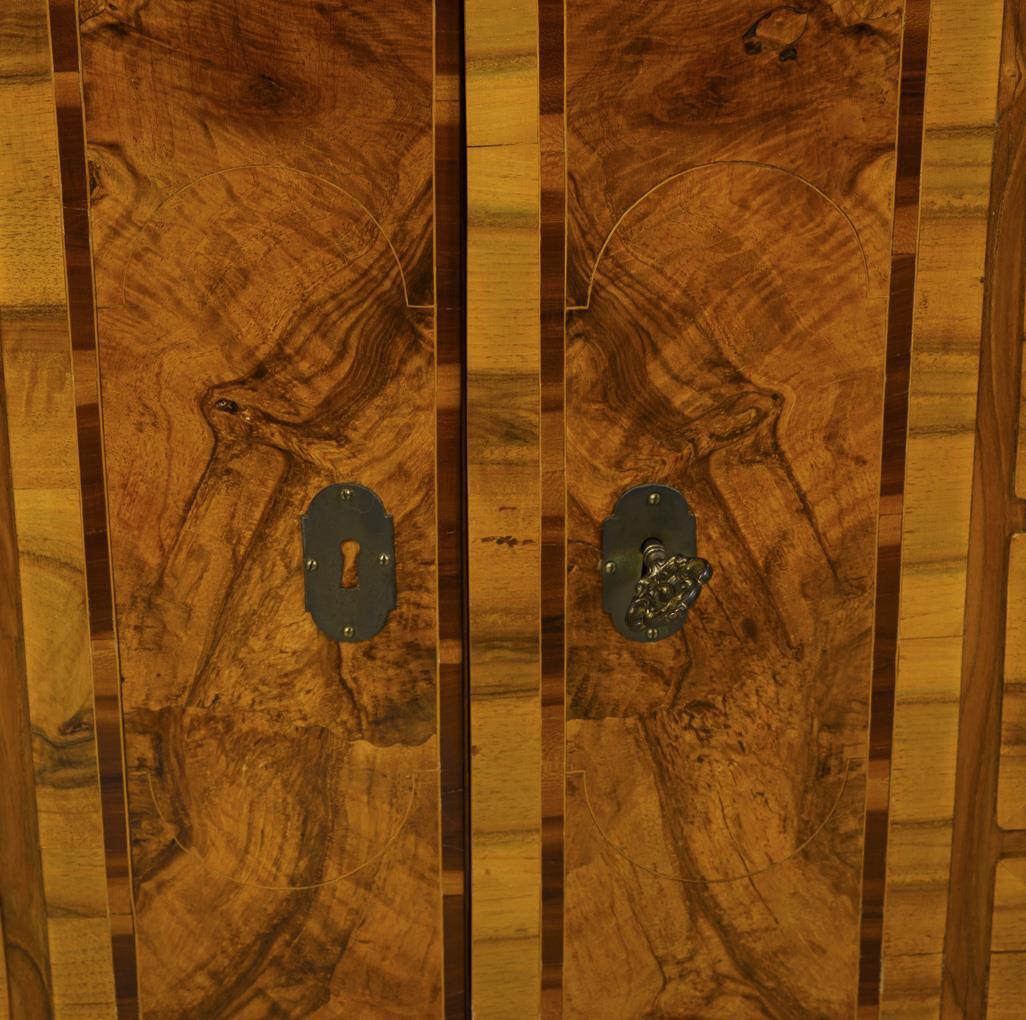Nussbaum und andere Hölzer furniert und maserfurniert. Ca. 90 x 88 x 27 cm.