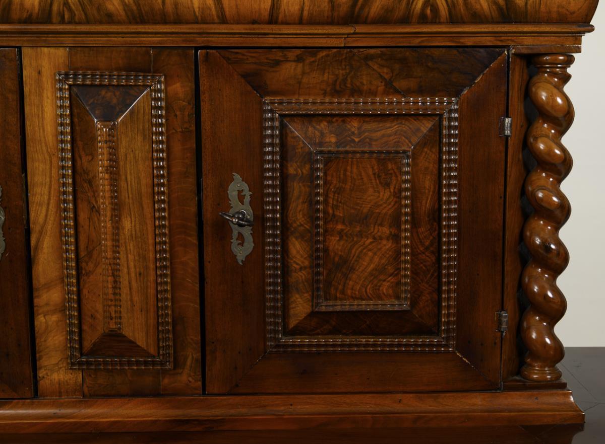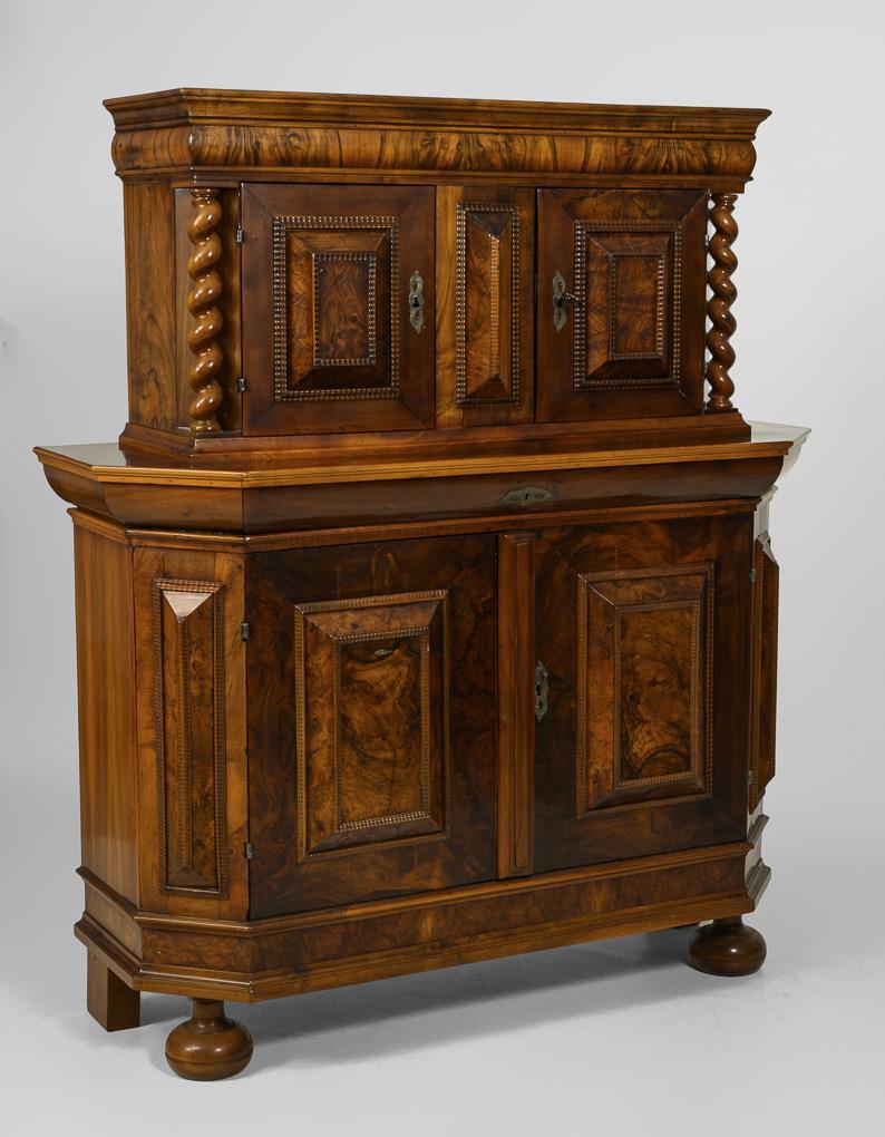 Üppig verzierter, 2-geschossiger, sogenannter "Kissenschrank" mit leicht zurückgesetztem Überbau auf 2-türigem Unterteil mit darüberliegendem Schub und abgeschrägten Seitenteilen, dekoriert mit Kissenfüllungen und gedrehten Säulen, zwischen Ober- und Unterteil umlaufende Stellfläche; Oberteil mit 4 Geheimfächern hinter mittlerer Kissenfüllung. Wohnfertig restauriert.
