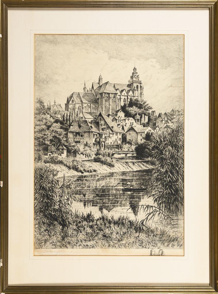 Ansicht des Wetzlarer Doms mit Altstadt und Fluss Lahn. Glas fehlt, Blatt gebräunt.
