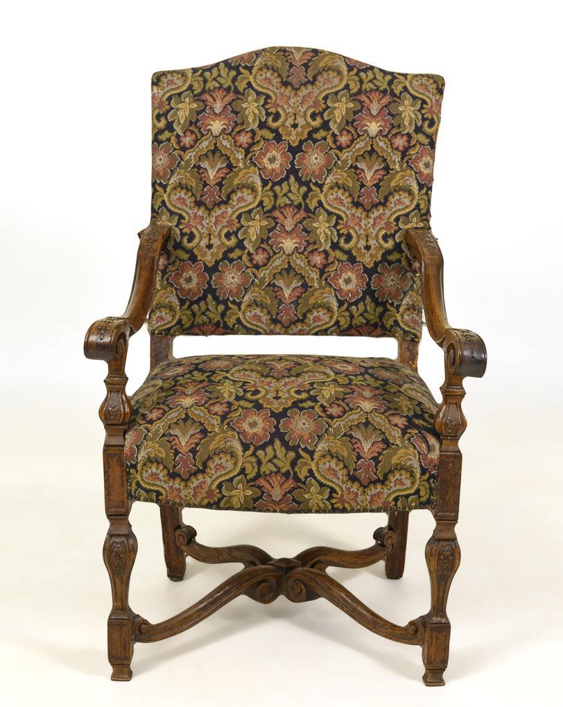 Bequemer Sessel in stiltypisch geschwungener Form, mit gepolsterter Rückenlehne und Sitzfläche, volutierte Armlehnen mit Reliefschnitzerei; Bezug mit üppigem Floralmuster und Ziernagelung. Restauriert und restaurierungsbedürftig, inaktiver Anobienbefall, Polster und Bezug ergänzt.