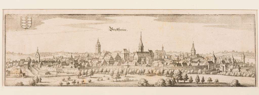 2 zentralperspektivische Stadtansichten "Brettheim" und "Eppingen", aus: "Topographia Germaniae", 1642 - 1654. Bugfalte und kleinere Knicke.