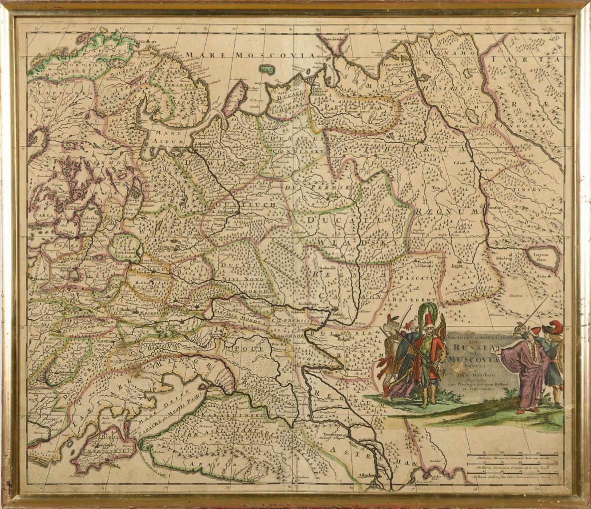Detailreiche historische Karte von West- und Zentralrussland, mit figürlicher Titelkartusche "Novissima et Accuratissima Totius Russiae vulgo Muscoviae Tabula [...]" und Meilenzeigern. Blatt gebräunt, verschmutzt, Spuren von Wurmfraß, Bugfalte.