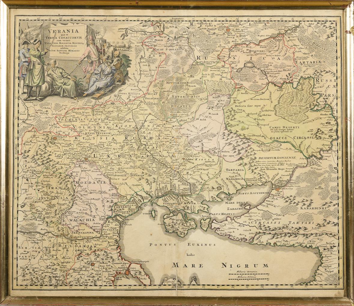 Detailreiche historische Karte der Ukraine und der Kosakengebiete in der Walachei, Moldawien, Kleinasien und den Provinzen der Tartaren, mit figürlicher Titelkartusche "Ukrania quae et Terra Cosaccoum cum vicinis Walachiae, Moldaviae, Minorisq., Tartariae provinciis [...]" und Meilenzeiger. Stockfleckig, Bugfalte, griff- und knickspurig, Spuren von Wurmfraß.