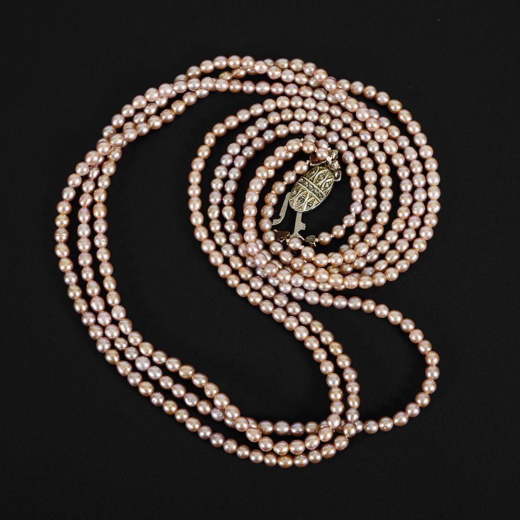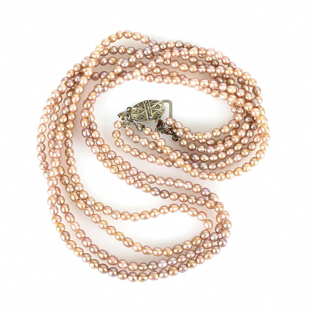 Schnürketten mit kleinen Zuchtperlen. Zierschließe mit Markasitbesatz.