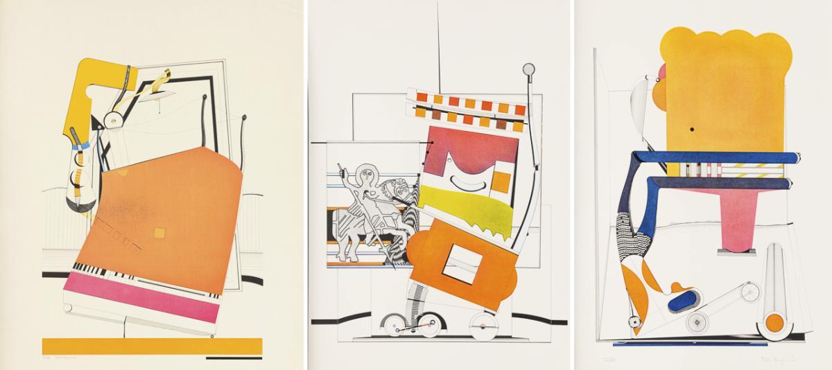 "Abstrahierter Kutscher mit Wagen", Blatt: 64 x 45 cm | Ohne Titel, Blatt: 60,5 x 50 cm, Tuschsignatur, Exemplar: 30/50, obere rechte Ecke etwas geknickt | "Skateboarder auf Halfpipe", Bleistiftsignatur, Blatt: 64 x 45 cm, Exemplar: 35/200.