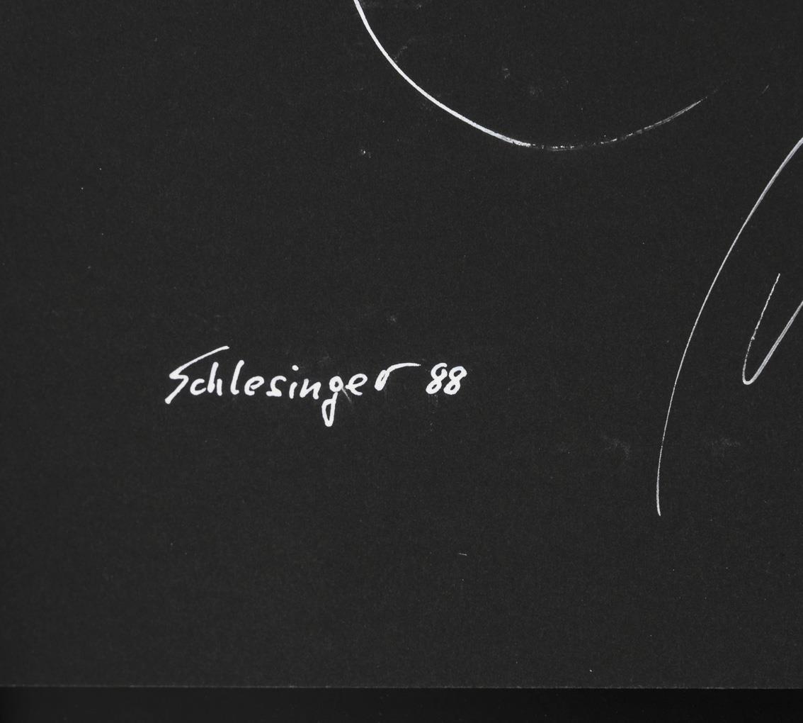 Weißer Pinselstrich auf schwarzem Karton. Pinselsignatur. 1988.