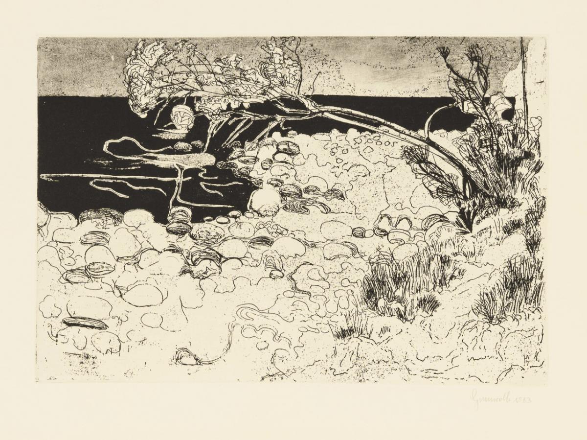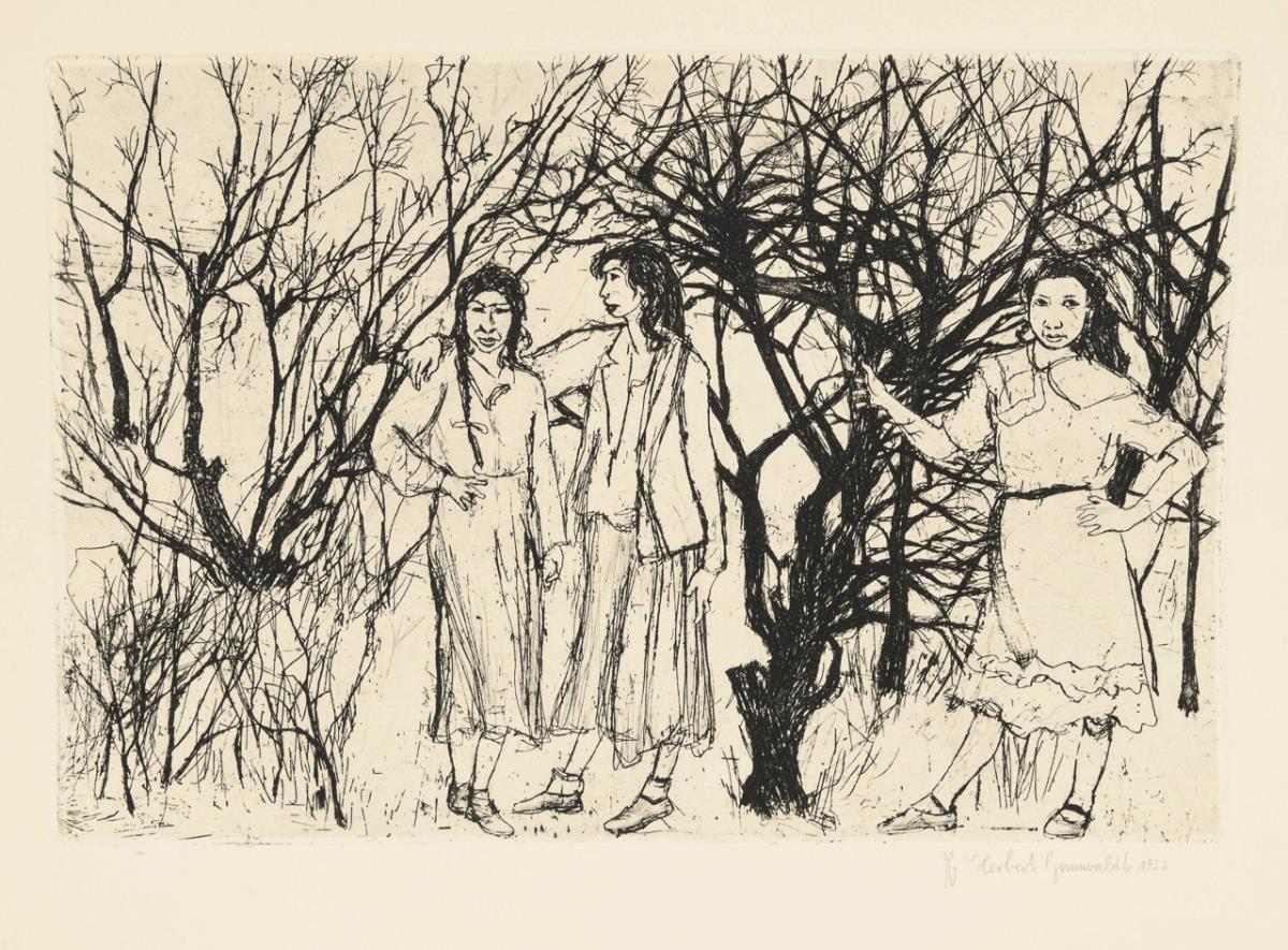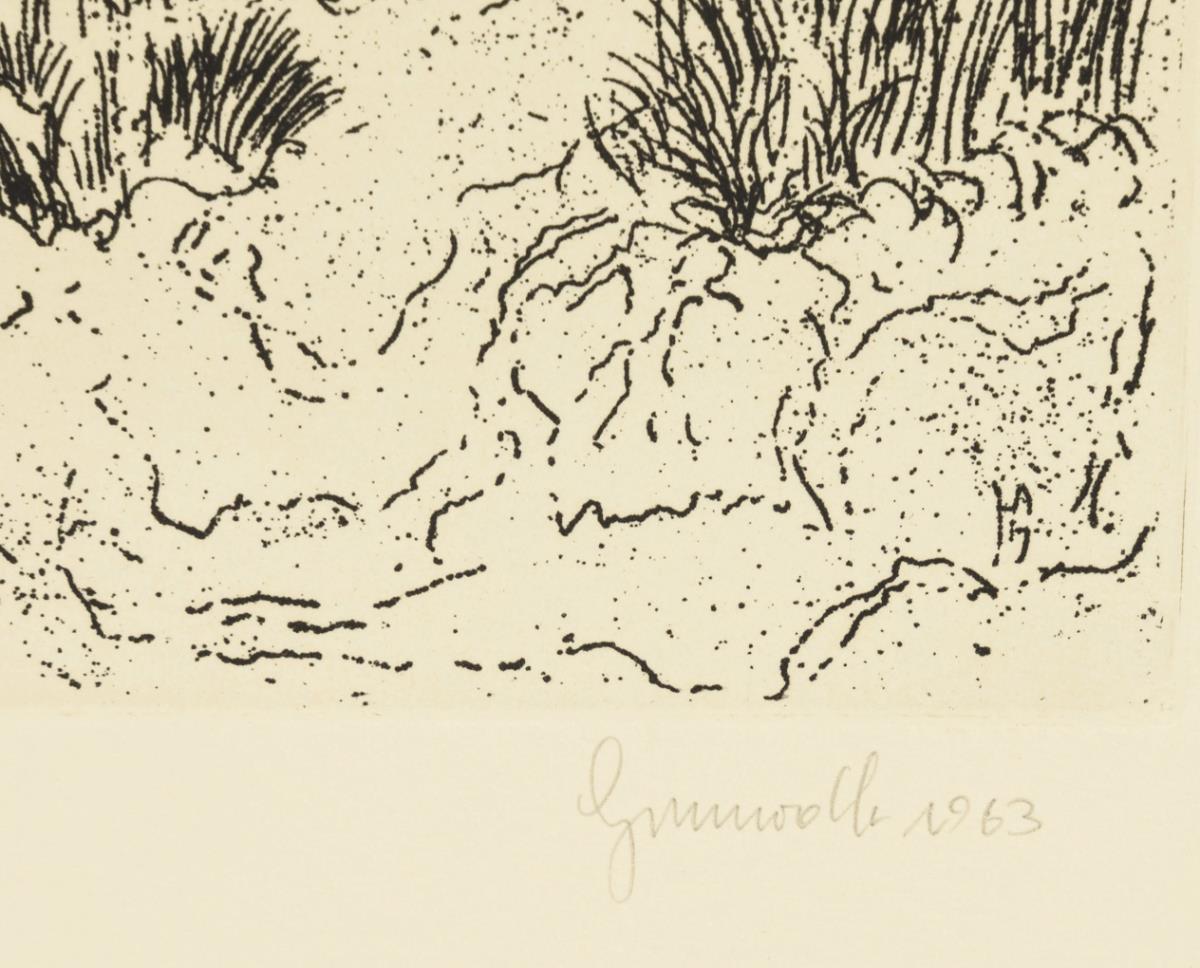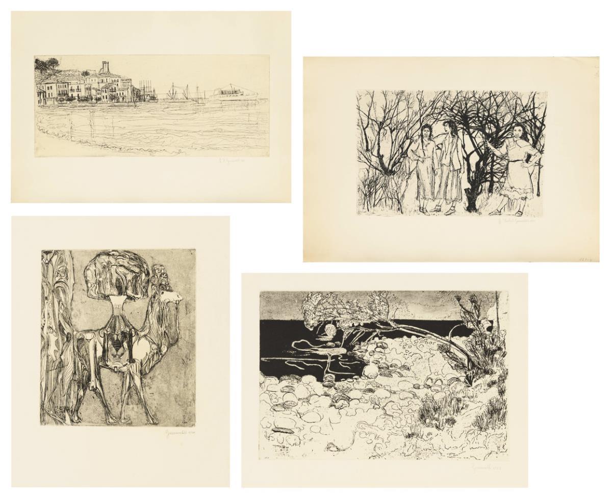 Südländische Stadt am Wasser, Platte: 19,7 x 45 cm, Blatt: 38,3 x 54 cm, 1961, etwas griffspurig | Landschaft am Wasser, Platte: 19,7 x 28,5 cm, Blatt: 38 x 53,5 cm, 1963, Randbereich etwas gebräunt | Geschmücktes Lama, Platte: 22 x 19,5 cm, Blatt: 54,5 x 38 cm, 1964, Randbereich etwas gebräunt | Drei Damen in karger Landschaft, Platte: 23,5 x 34 cm, Blatt: 38 x 54 cm, Randbereich etwas gebräunt.