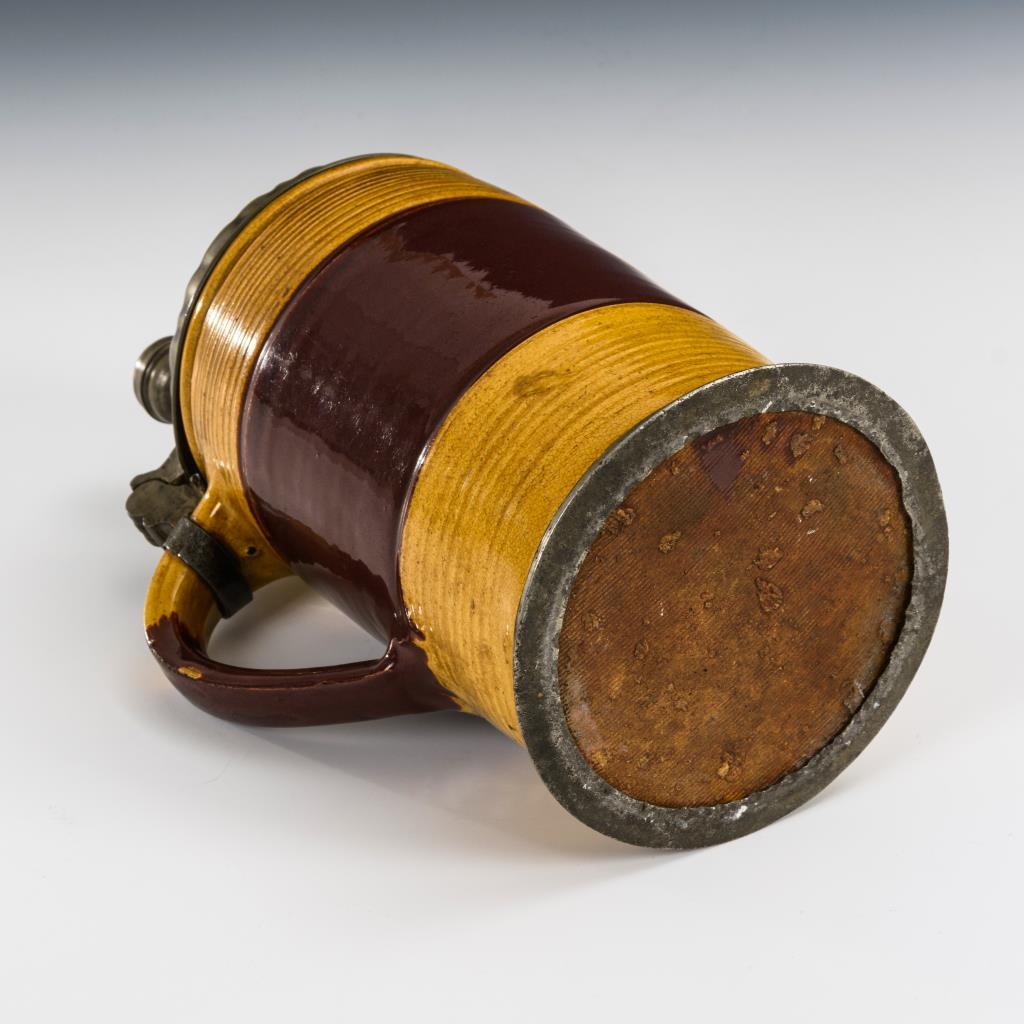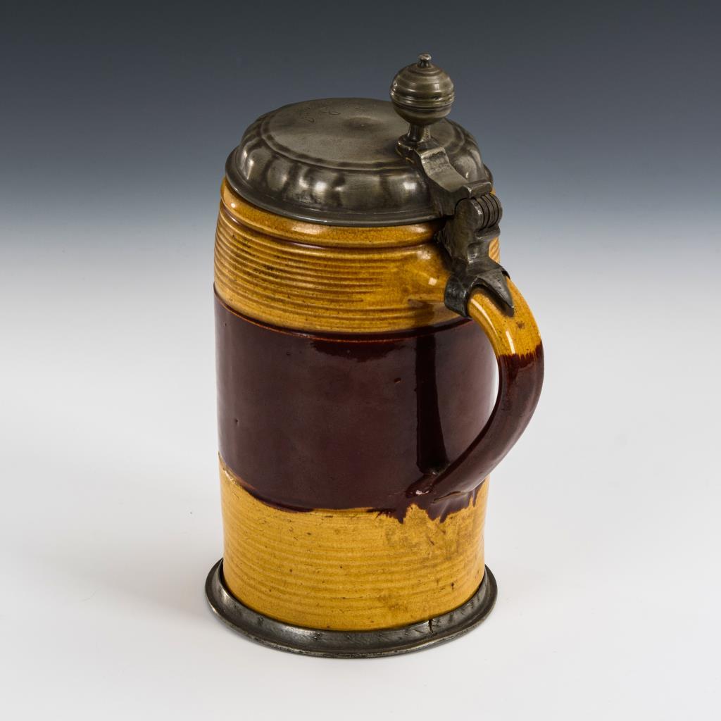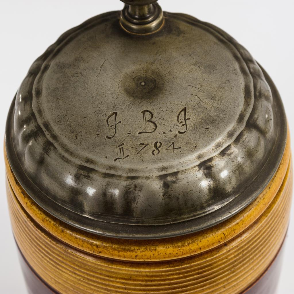 Walzenkrug mit Parallelrillen im oberen und unteren Bereich sowie Bandhenkel. Profilierter Zinndeckel mit Kugeldrücker, graviert "J.B.J. 1784", Zinnstandring. Lippe und Henkel minimal glasurbestoßen, Zinnmontierung mit fehlendem Halsring, leichte Alters- und Gebrauchsspuren..