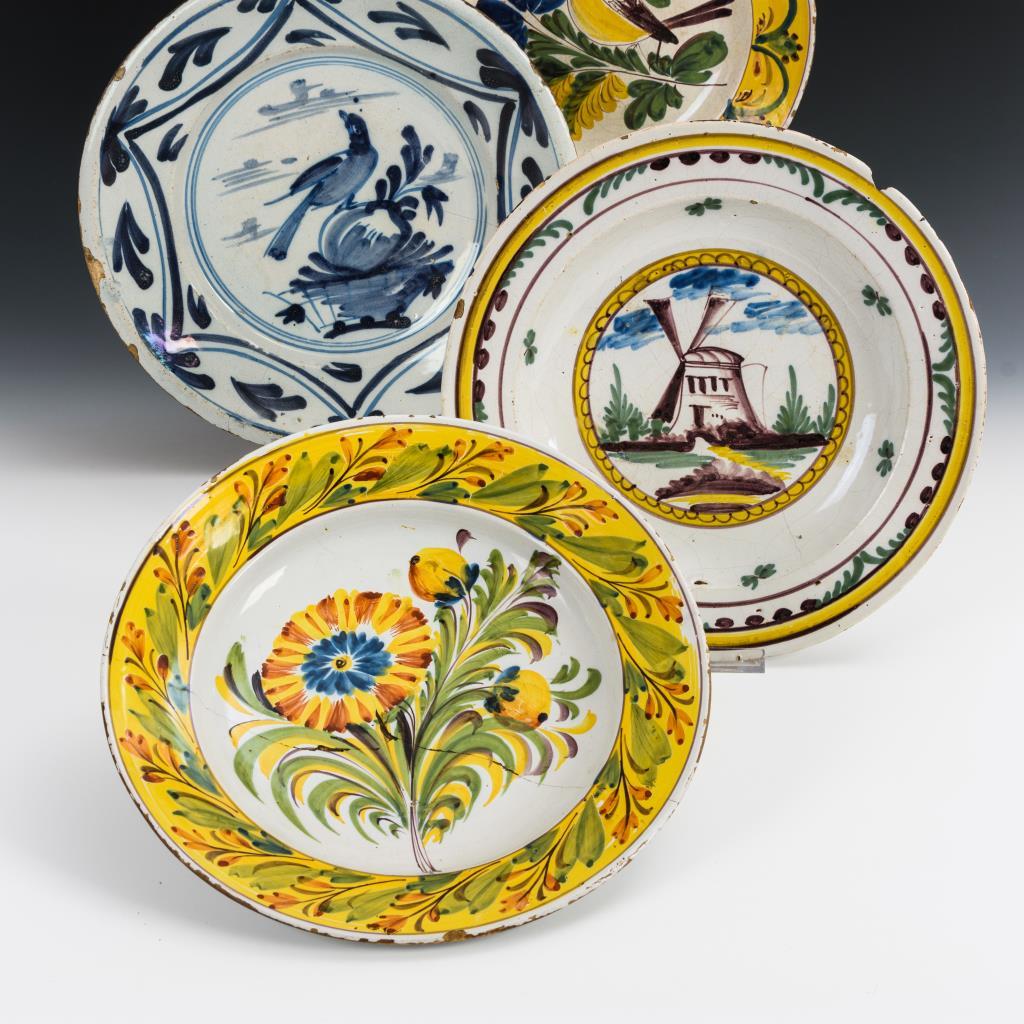 Runde Teller mit glatter Fahne, im Spiegel 2x Vogelmotiv, 1x Windmühle, 1x Blumenstrauß. Ohne Aufhängungen. Mit Defekten und Altersspuren.