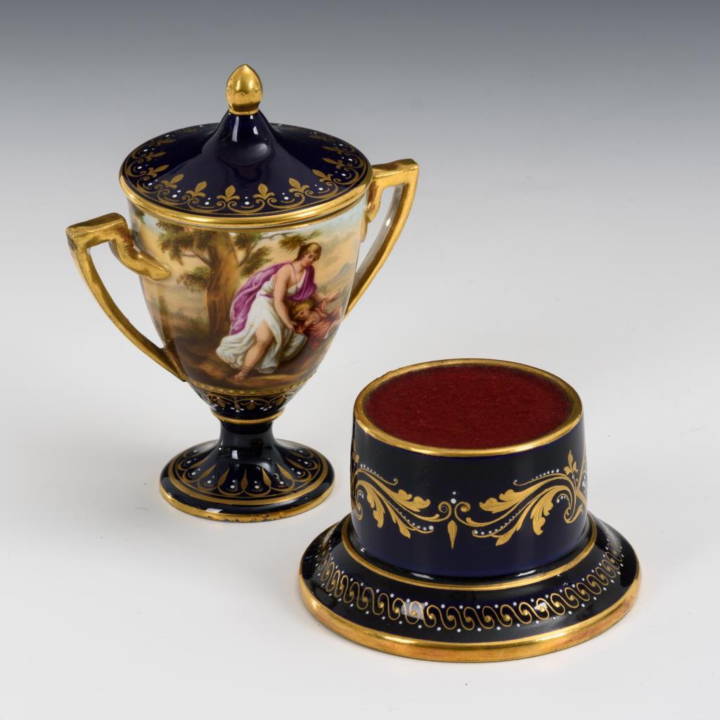Halbovoide Vase mit zwei gewinkelten Henkeln, Knaufdeckel und Rundfuß, auf rundem Sockel. Kobaltfond mit ornamentaler Goldmalerei mit weißen Emailpünktchen, umlaufend gemalte mythologische Szenen.