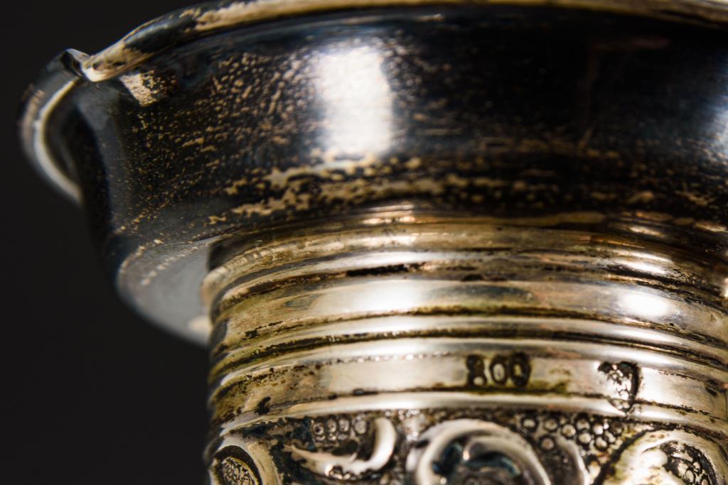 Sogenannte "Gluckerflasche" mit geschliffener Rocaillenzier und plastischem Putto als Deckelknauf.