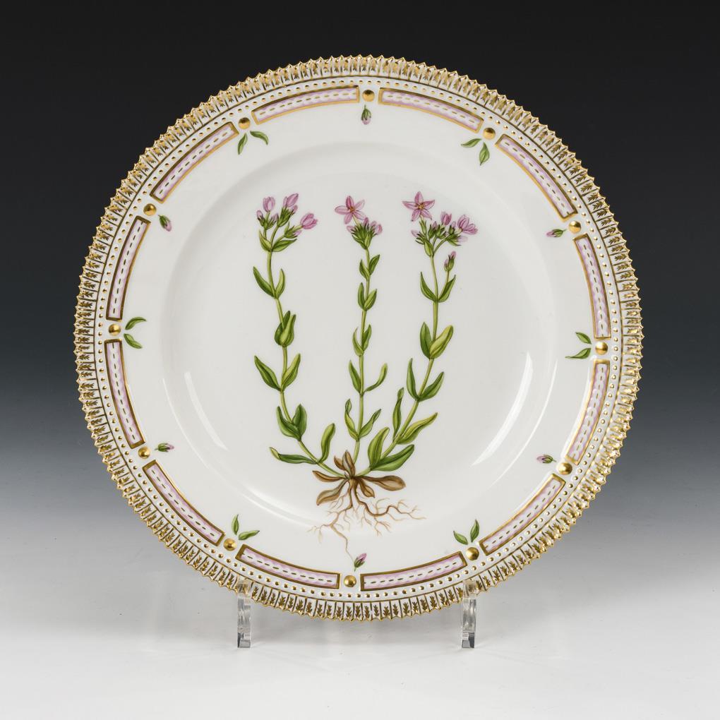 Speiseteller mit gezacktem Rand. Im Spiegel die Darstellung des Strandtausengüldenkrautes, unterseitig lateinisch bezeichnet.
