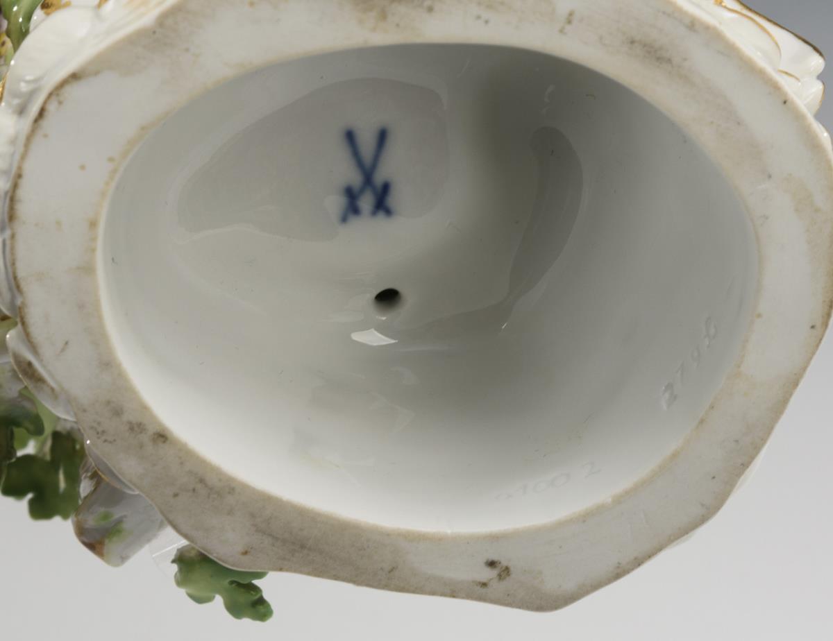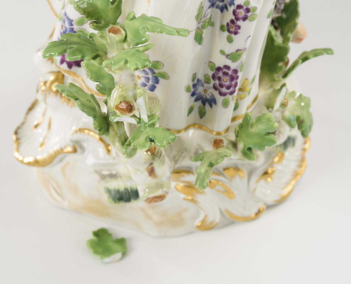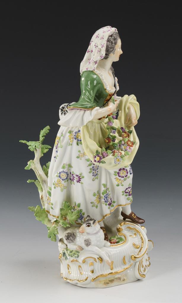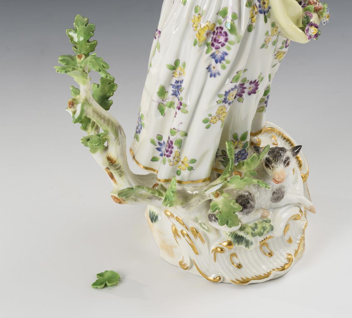 Auf einem Rocaillesockel stehende Schäferin mit blütengefüllter Schürze, zu ihren Füßen ein Lamm liegend. 4 Eichenblätter fehlen, 2 Eichenblätter lose anbei, Blütenblatt bestoßen.