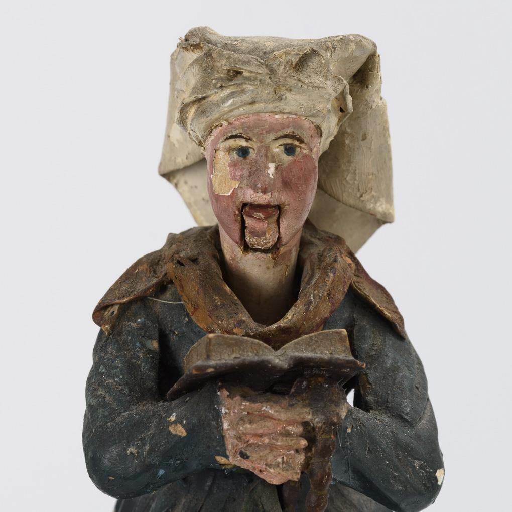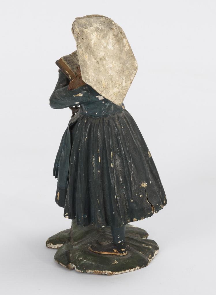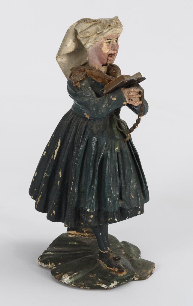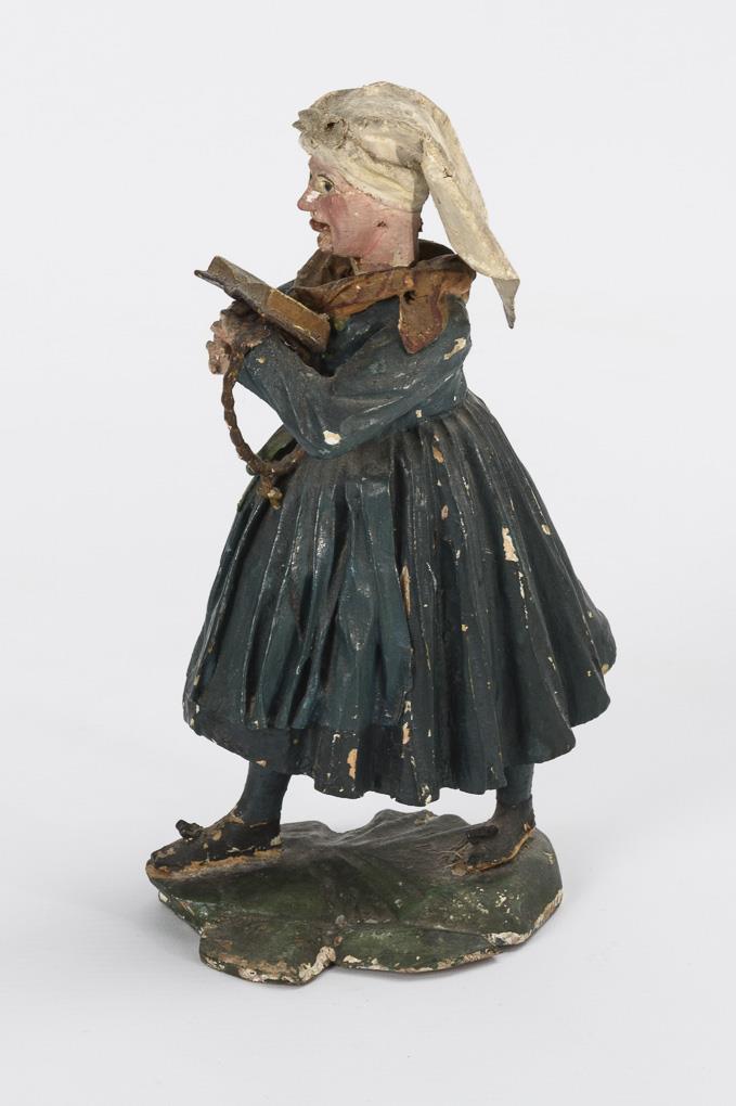 Wackelfigur einer Bäuerin wohl beim Kirchgang mit Buch und Rosenkranz in den Händen, wobei ihr Kopf nach einem Anstoß leicht und lang anhaltend nickt. Beweglicher Mund wackelt nicht mit, Farbabsplitterungen, Klebespuren an Buch/Händen.