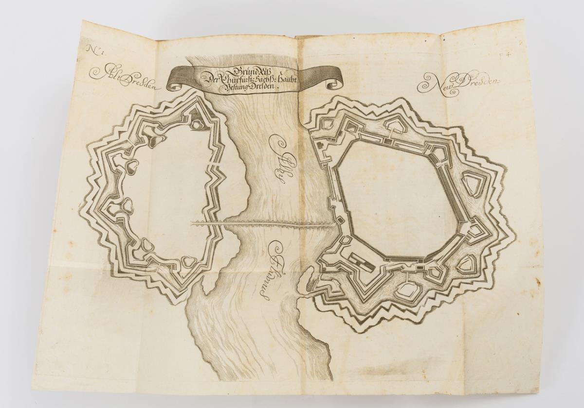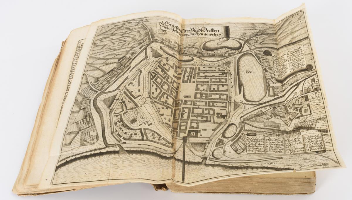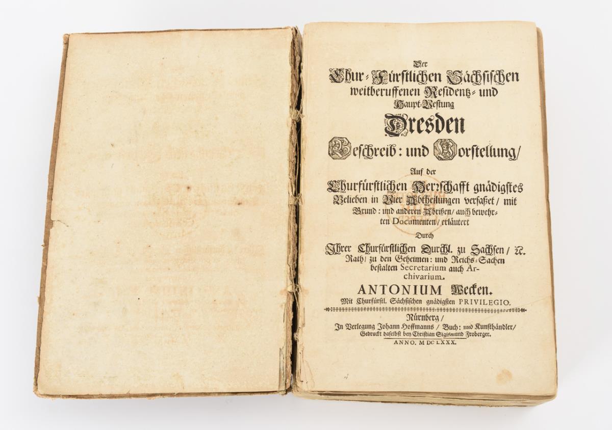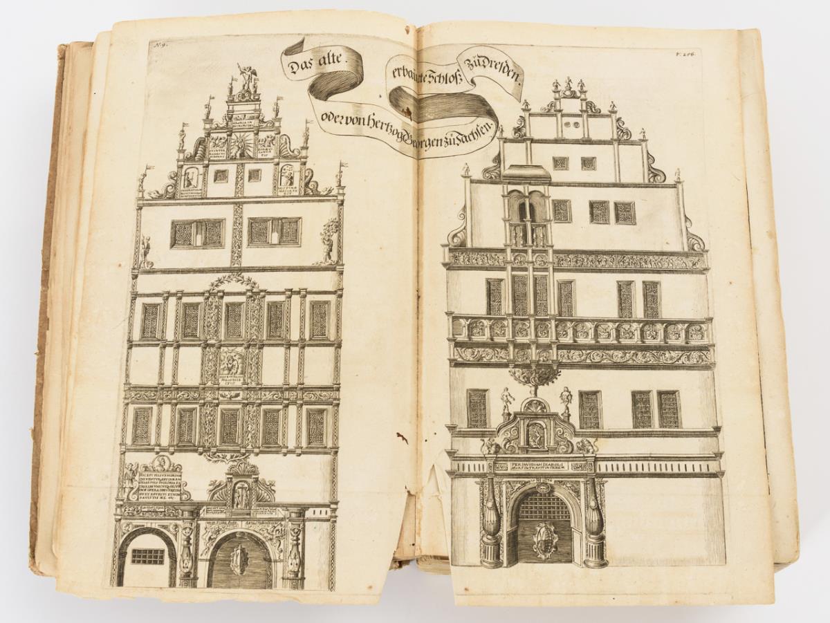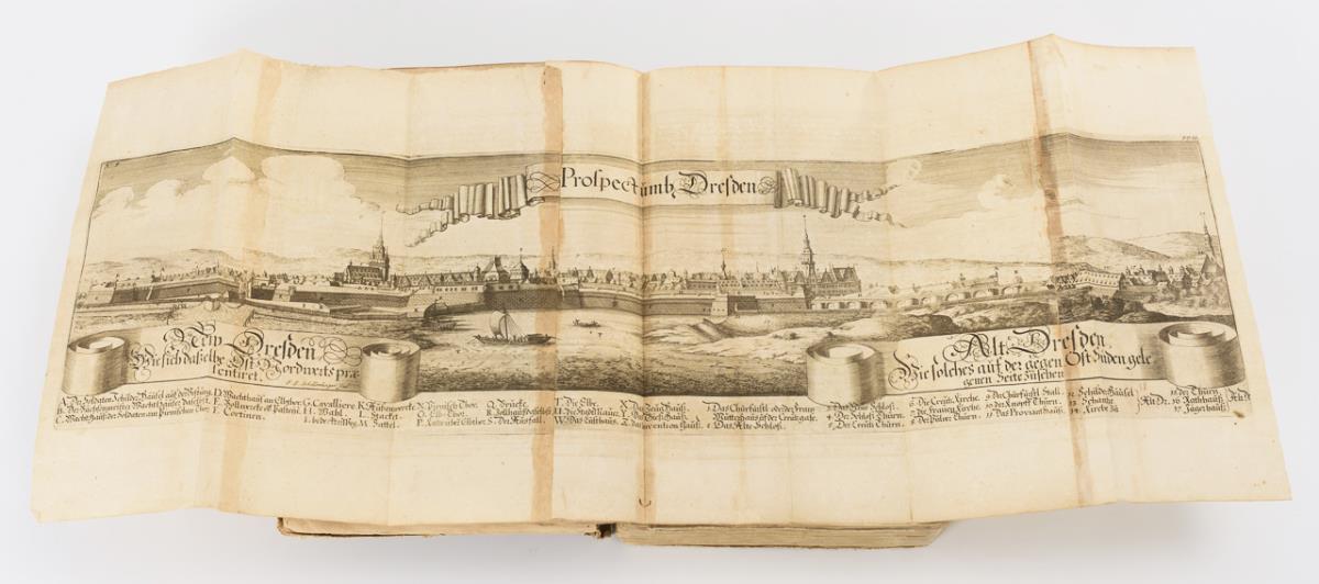 Darunter auch Fortifikationsplan von Dresden, sowie frühe Ansichten. Im einfachen Pappeinband. Rücken, Deckel und einige Seiten lose, wenig Fraßspuren im Bindungsbereich. Einige Tafeln eingerissen.