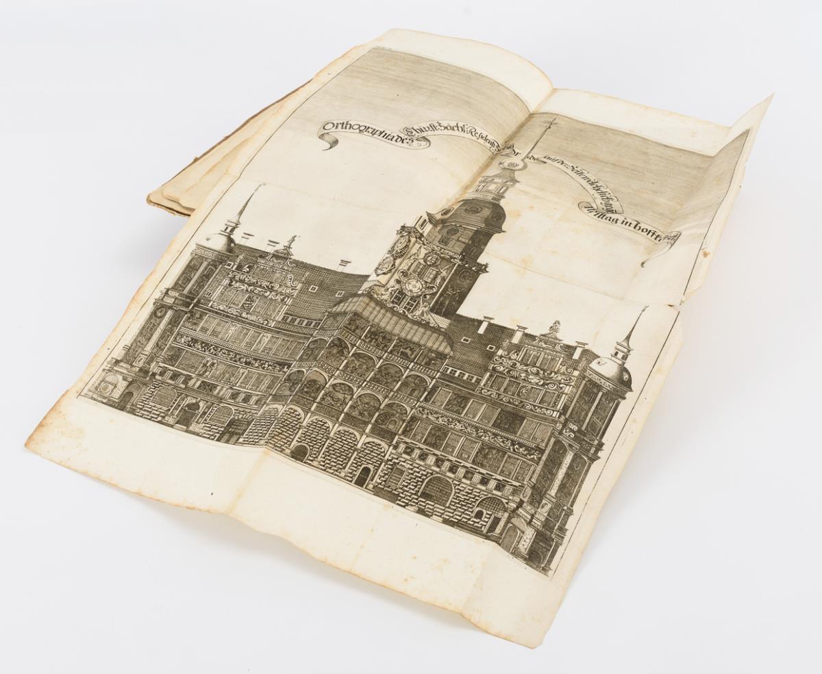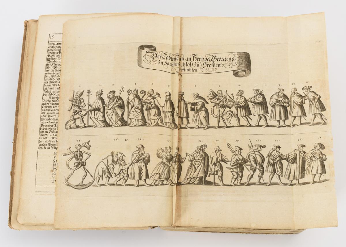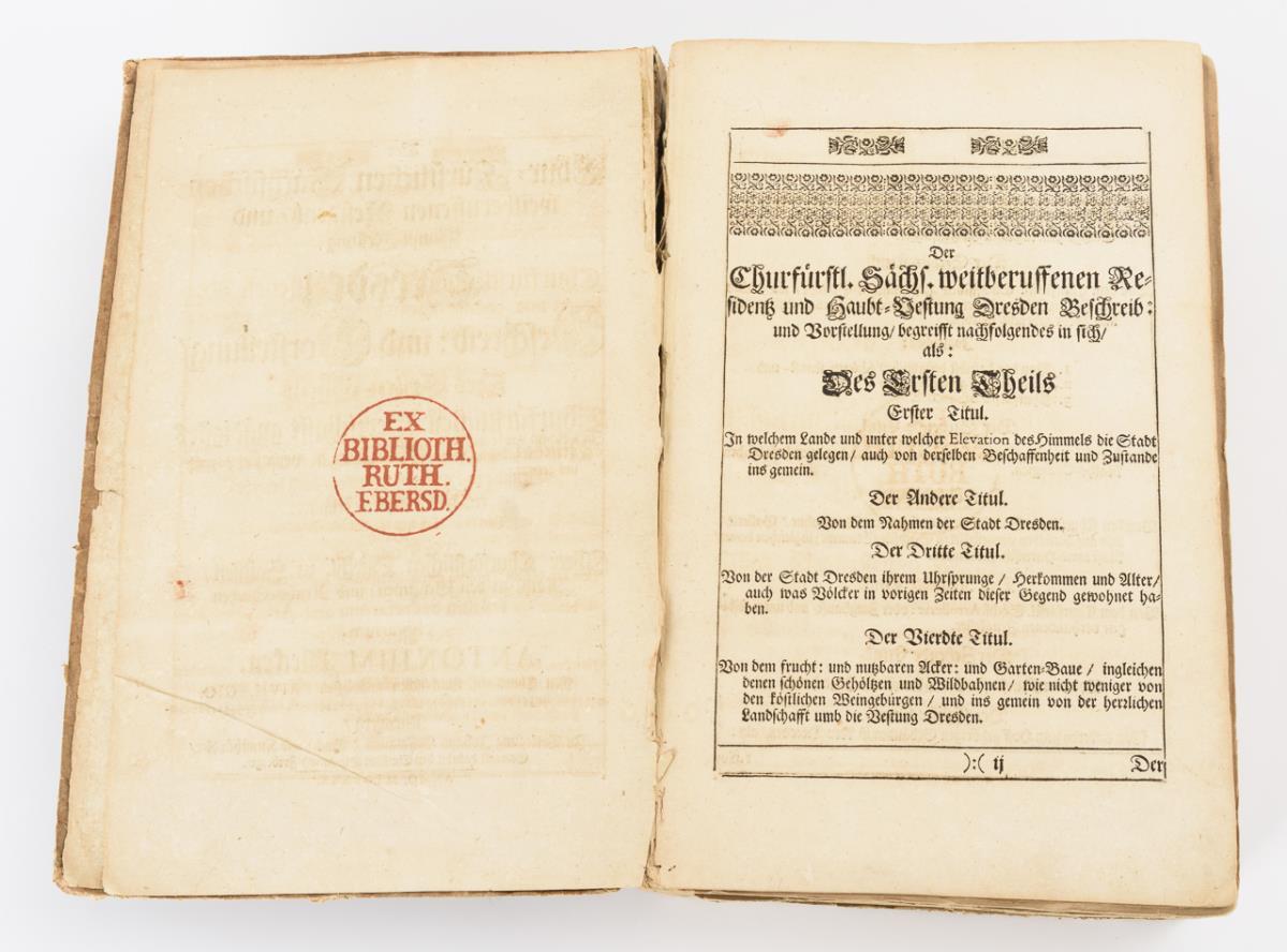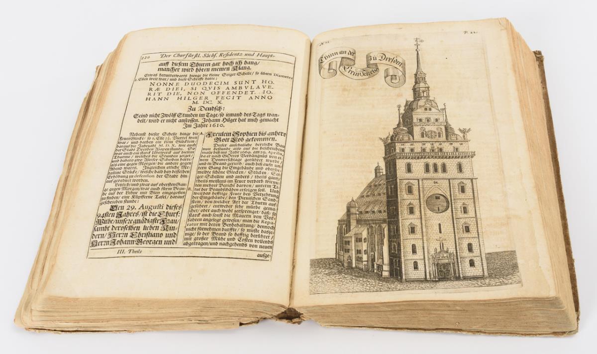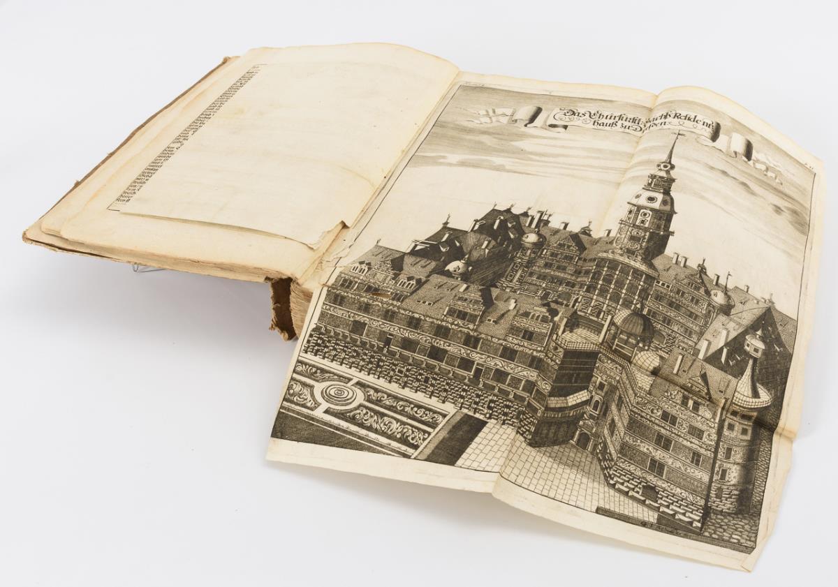 Darunter auch Fortifikationsplan von Dresden, sowie frühe Ansichten. Im einfachen Pappeinband. Rücken, Deckel und einige Seiten lose, wenig Fraßspuren im Bindungsbereich. Einige Tafeln eingerissen.