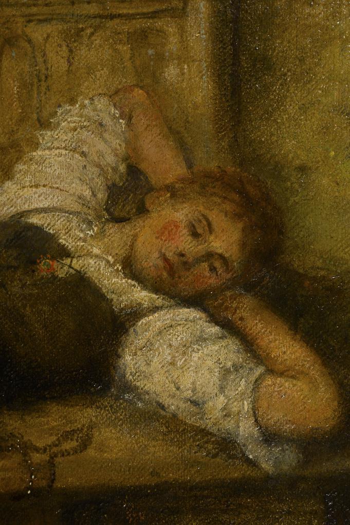 Junge Magd mit Rosenkranz und nachdenklichem Blick auf der Bank. Wenig retuschiert.