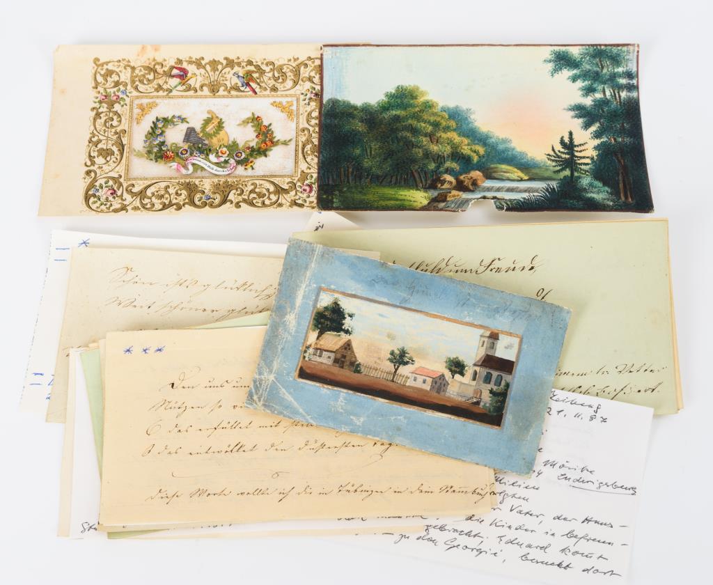 Schatulle mit gemalter Miniatur auf dem Deckel; im Deckel kolorierte Lithografie Kahnpartie (Ebner/Augsburg); dahinter Geheimfach mit leeren Zetteln. Innen ca. 18 Blätter (Zumeist Stammbuchblätter, häufig Tübingen und Stuttgart 1833-44, 1 Luxuspapier, 2 Gouachen, 1 Aquarell). / Brieftasche aus feinem Leder innen mit roter Seide ausgeschlagen sowie Beinstift mit Bleispitze. Darin etliche Visitenkarten von Carl Rehfus/Catharina Seitz aus Kehl/Schwetzingen 1854 sowie ca. 12 Briefe zumeist aus Wieblingen 1856 - 1878. Starke Alters-/Gebrauchsspuren, wenige Fehlteile.