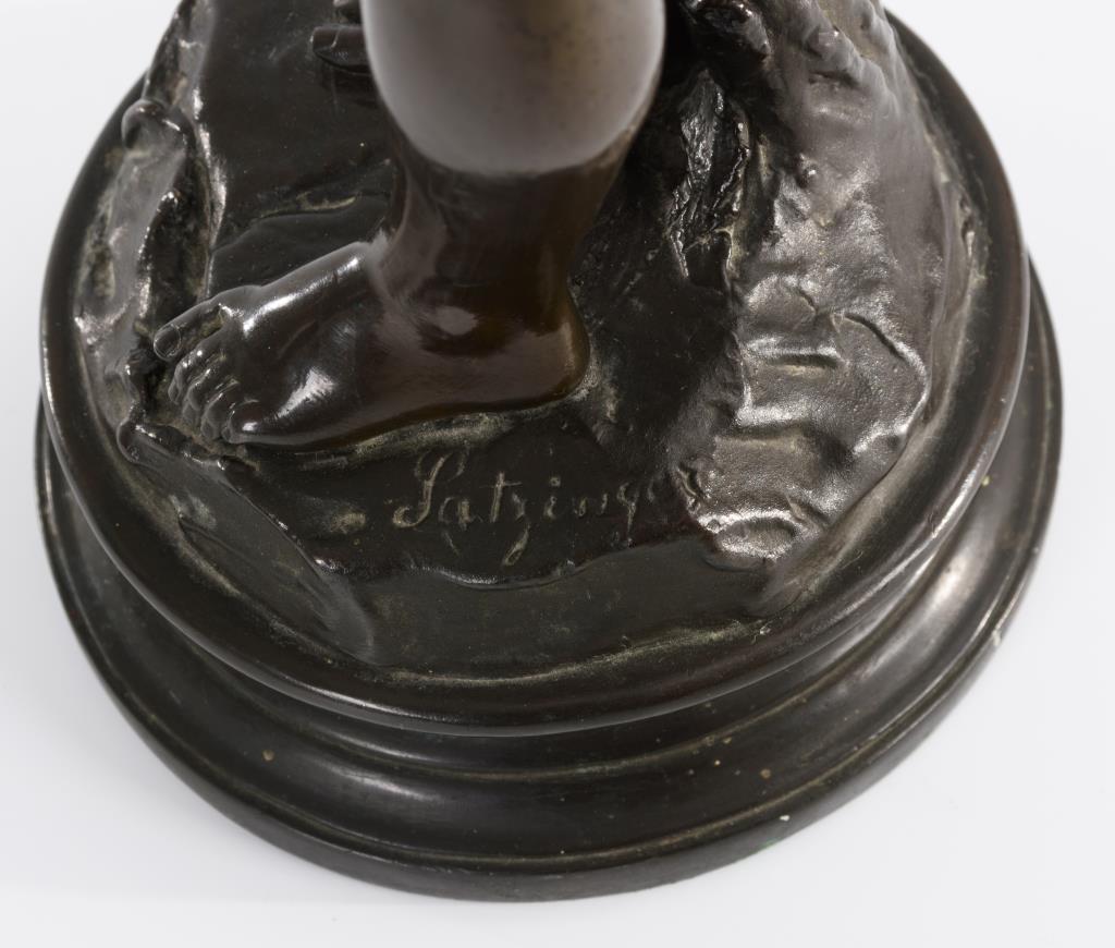 Galvanoplastik (Kupfer bronzefarben patiniert)."Satzinger " bezeichnet, auf der Standfläche Monogramm "NF" mit Nr. "20,866".H gesamt 43 cm.