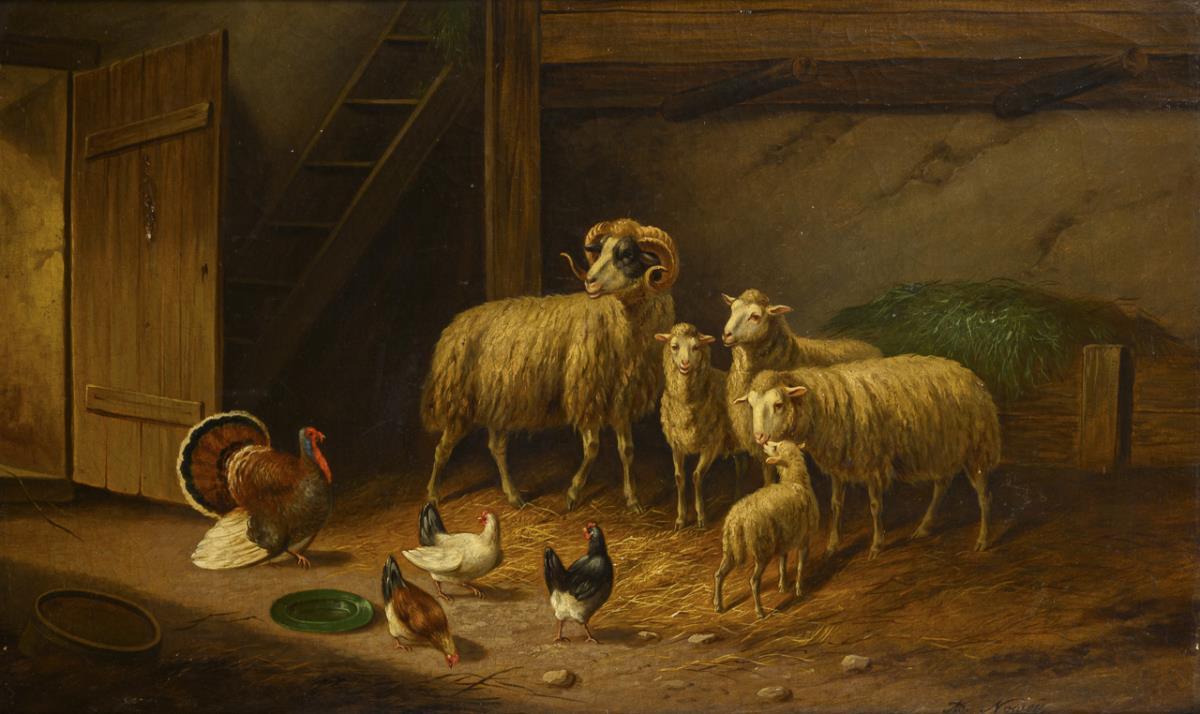 Die Tiere auf dem Stroh im Stall bei einfallendem Sonnenschein. Eine restaurierte Stelle.