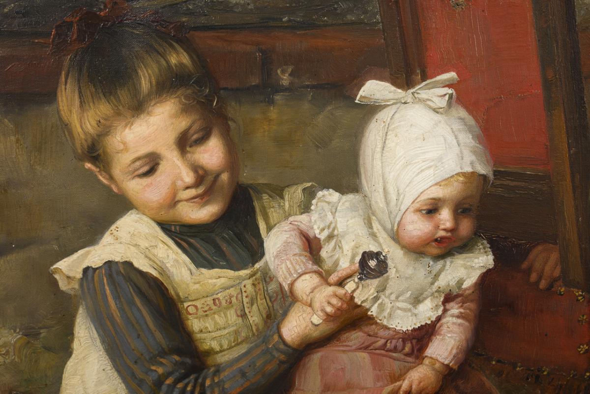 Drei Geschwister beim Beobachten der kleinen Katzen an der Milchschale. Altersspuren.