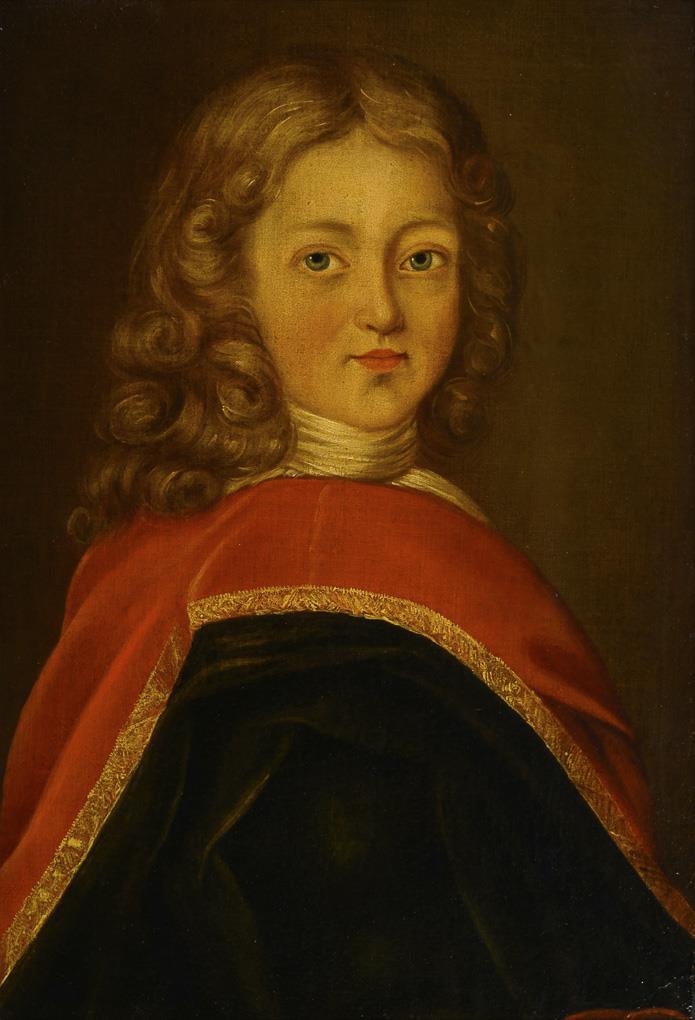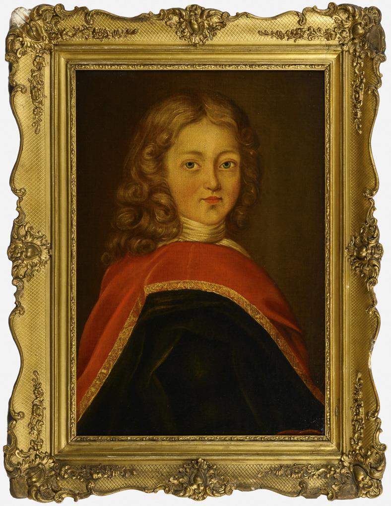Porträt eines jungen Mannes mit lockigem Haar und in herrschaftlichem Mantel. Leinwand doubliert.