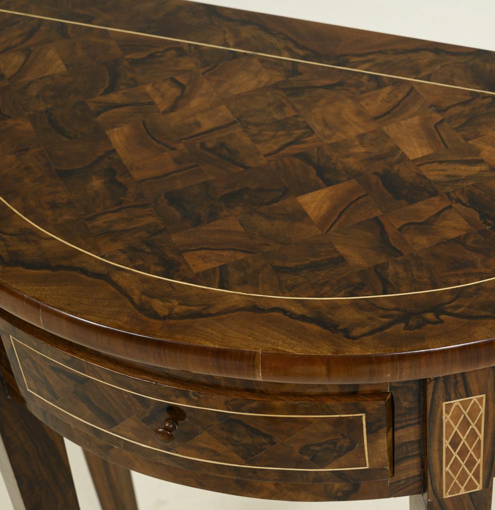 Zierlicher halbmondartiger Wandtisch auf 4 Pfeilerbeinen, mit parkettiertem Maserfurnier.