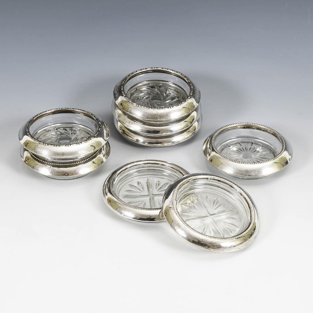 Leicht unterschiedliche Untersetzer, 4x F. B. Rogers, 2x Amston und 2x Whiting & Co gestempelt. Gebrauchsspuren, Silber teils etwas gedellt.