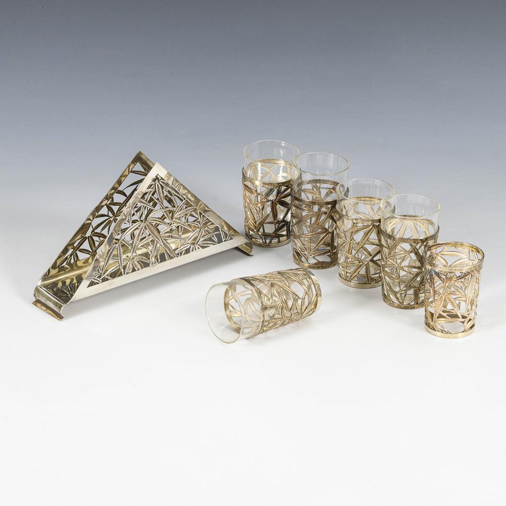 Silberner Serviettenhalter und 6 Schnapsgläschen.