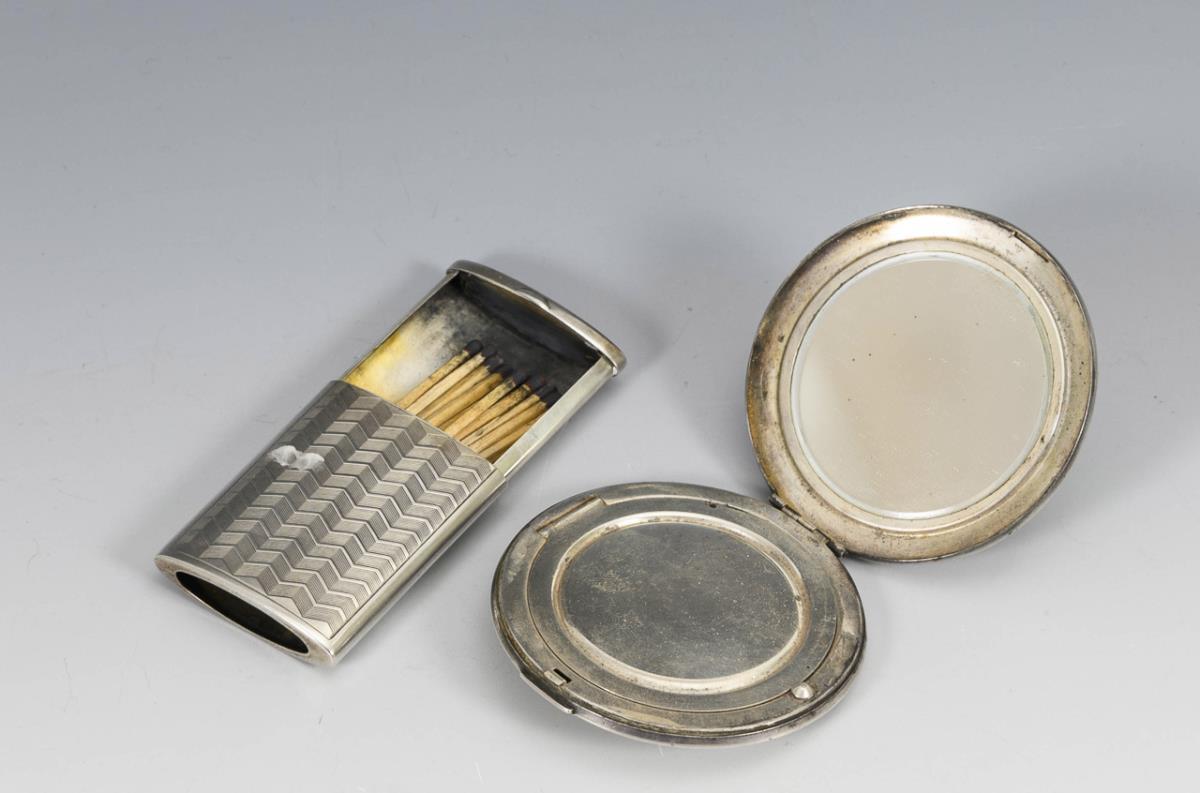2 Silberstifte, 2 Streichholz-Etuis (1x "Cartier, Made in USA"), ovaler Bilderrahmen, Döschen mit Perlmuttdeckel und runde Puderdose. Gebrauchsspuren.