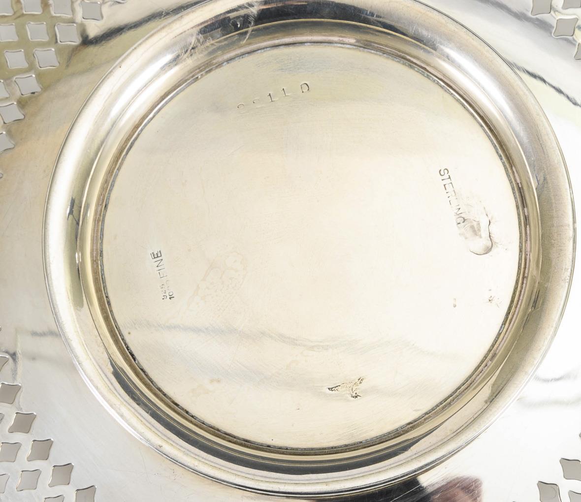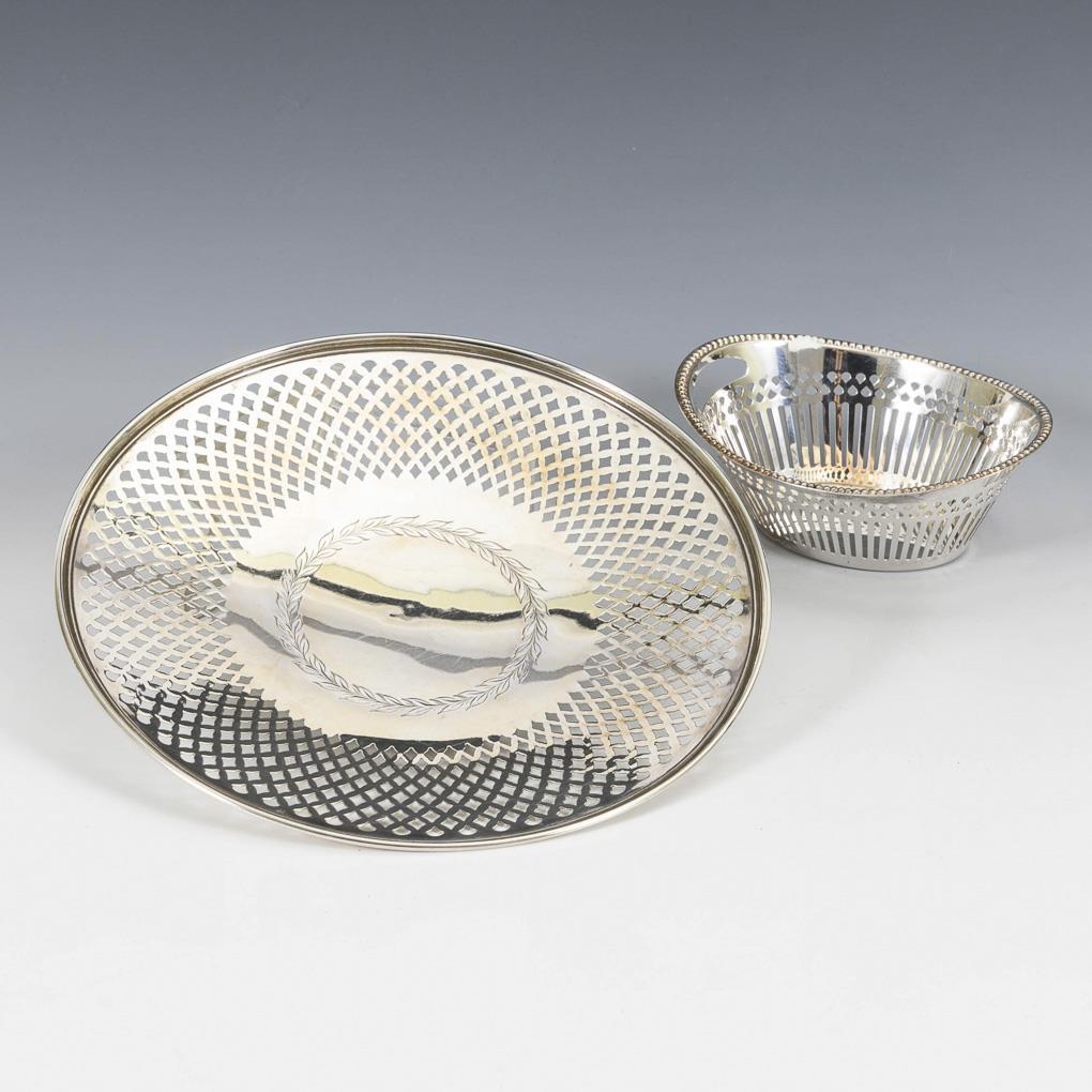 Durchbrochen gearbeiteter Tafelteller mit Lorbeerkranzgravur. Sterling gestempelt. Ø 23 cm. Dazu ovales Körbchen. "Keltum" gestempelt. 5 x 13,5 x 10,5 cm. Minimale Gebrauchsspuren.