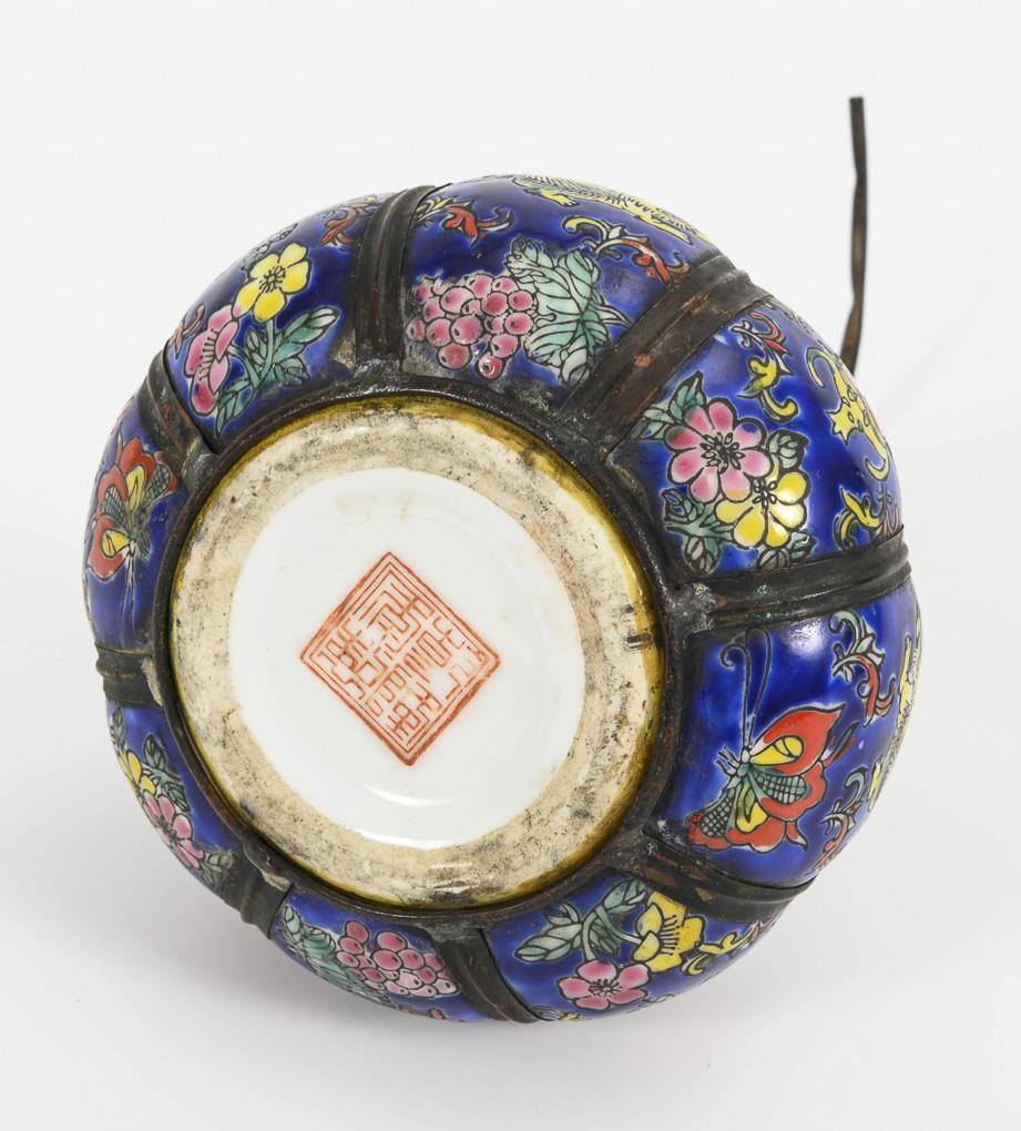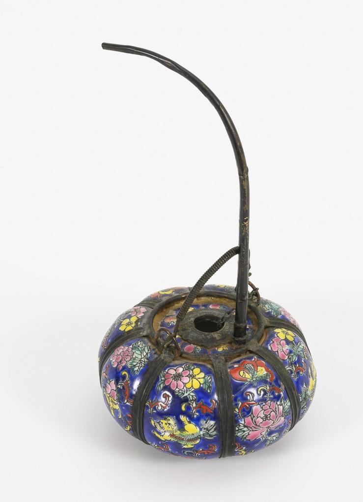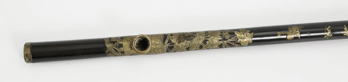 Stabartige Pfeife aus schwarz lackiertem Holz und gravierten Metalleinlagen sowie intarsierten Schriftzeichen. Alters- und Gebrauchsspuren, L 54,5 cm. / Gemarktes Porzellangefäß in Kürbisform mit Metallfassung und schmaler Öffnung. Altersspuren, gesamt H 24 cm.